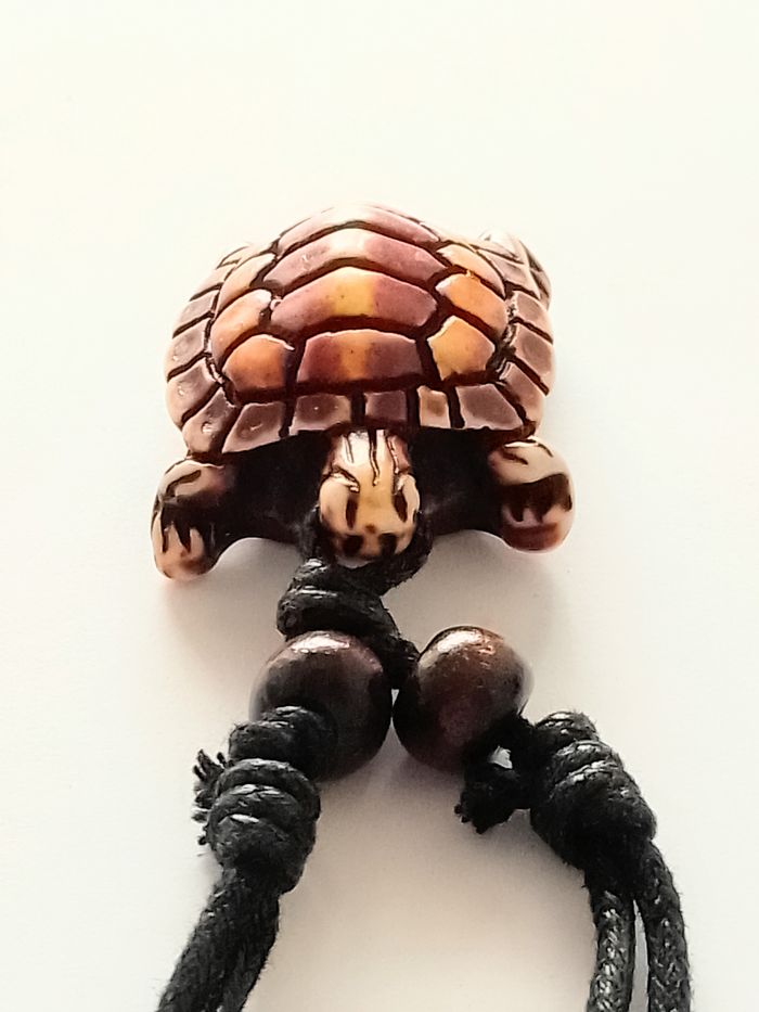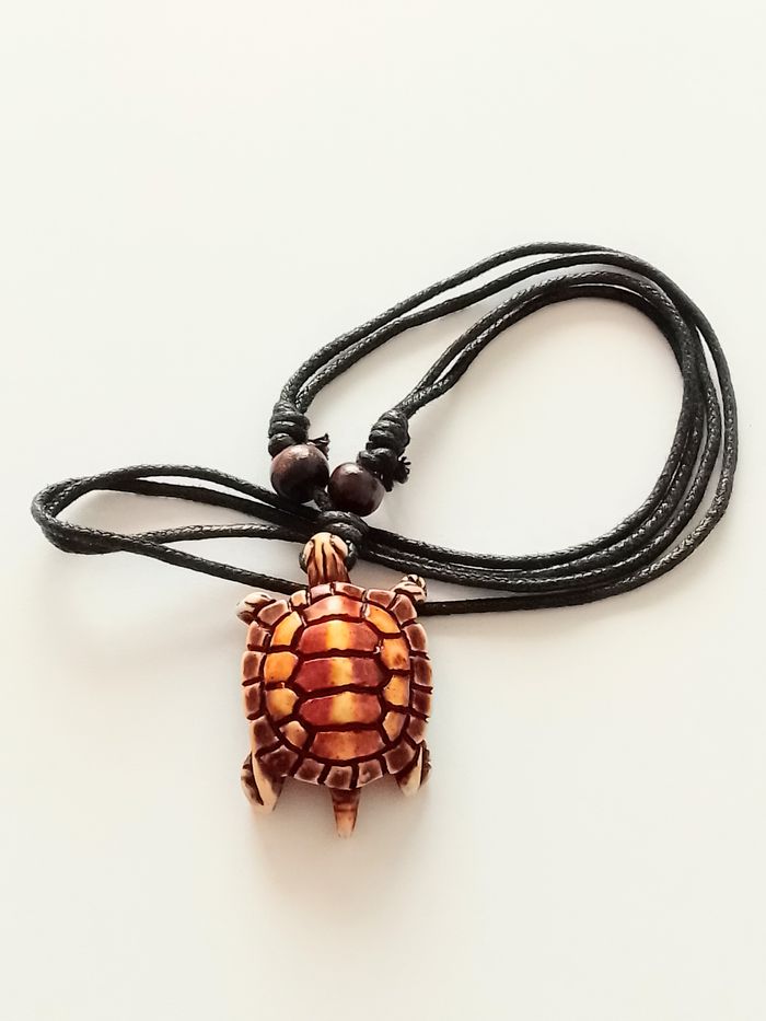Collier corde réglable, pendentif tortue. Pendentif : tortue. DESCRIPTIF : Couleur : marron. Taille chaîne : 40 cm à 80 cm Diamètre pendentif : 4,5 cm L* 3 cm H Envoi rapide et soigné.