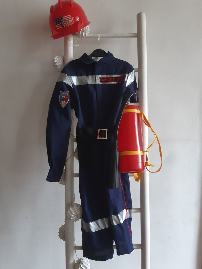 Déguisement pompier 3/4a (selon votre enfant)avec accessoires. La combinaison est en bon état, les scratchs tiennent bien. L'armature du casque à été abîmé pendant le carnaval à l'école🤷🏼‍♀️ (petit réparation à prévoir à la colle ou autre pour les mamans manuelles). Propre, désinfecté avec sanytol.
