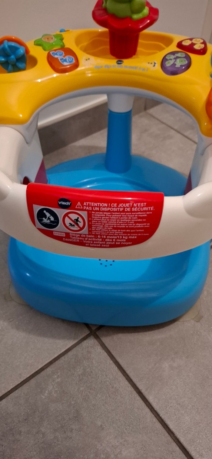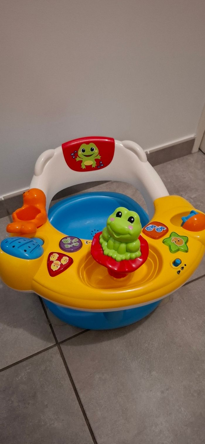 Siège de bain Vtech Un siège de bain et un tableau d'activités interactif pour découvrir les animaux de la mer Super sécurisé : 4 grosses ventouses pour adhérer au fond de la baignoire et un tableau d'activités amovible 4 boutons formes lumineux pour découvrir les formes, les animaux et écouter les mélodies et 1 bouton grenouille qui projette de l'eau Plus de 50 mélodies, sons et phrases différents