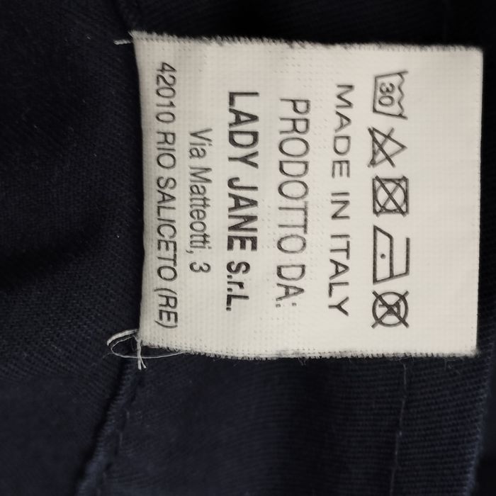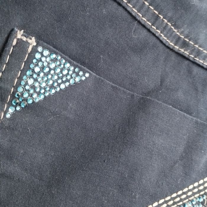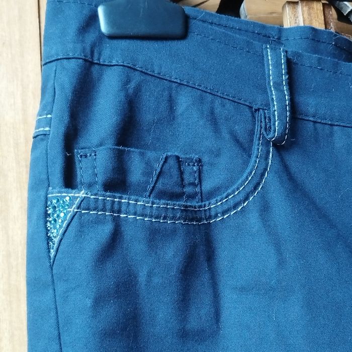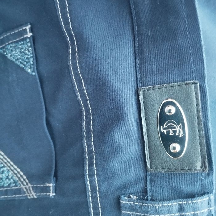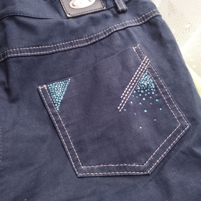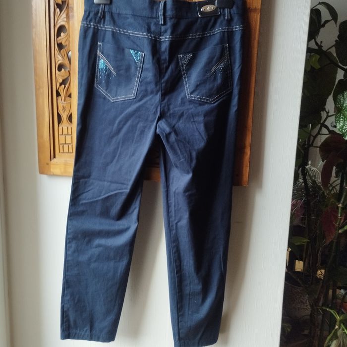 Pantalon pour femme de chez Carla Ferroni. Taille 40. Coloris bleu Marine foncé. Surpiqûres niveau poches et taille. Incrusté de pierre strass bleu clair. Comme neuf !