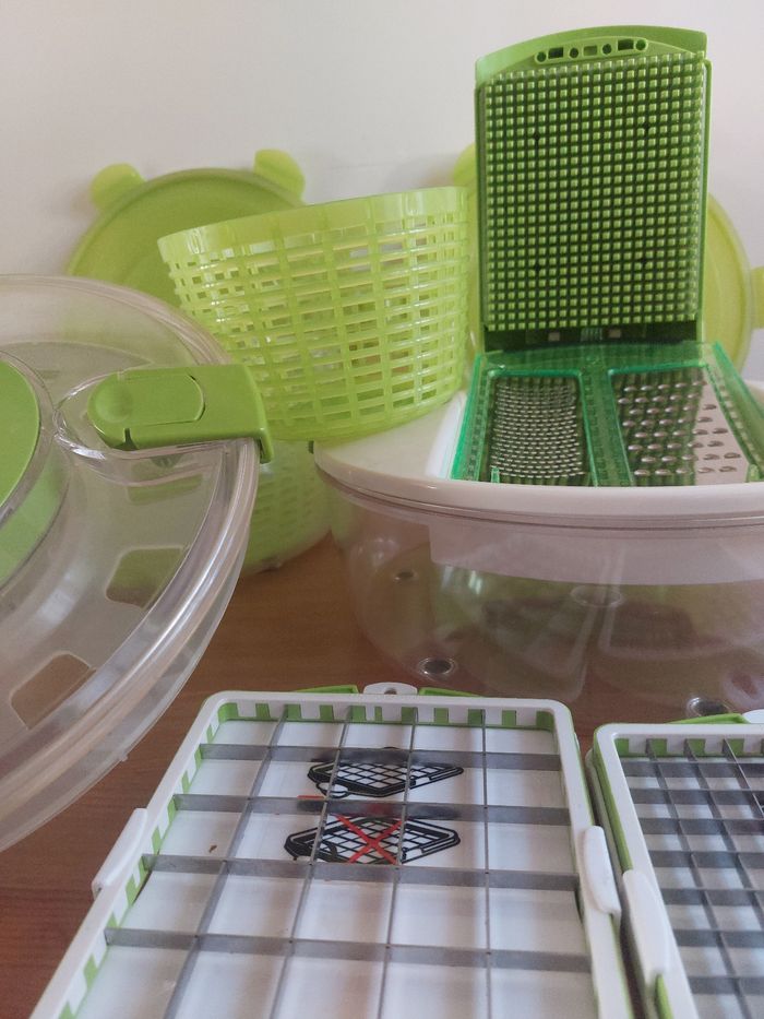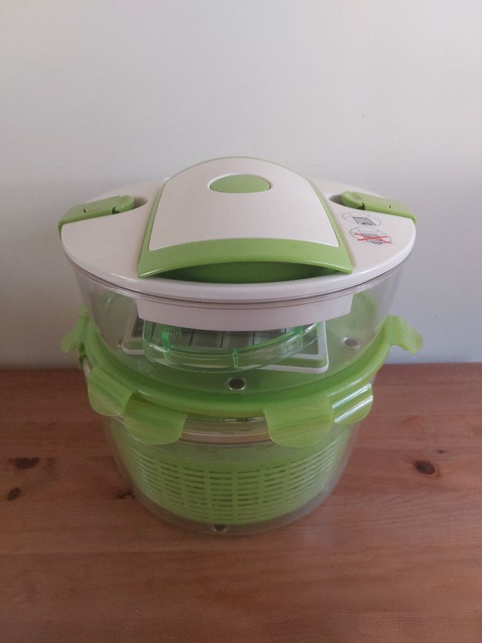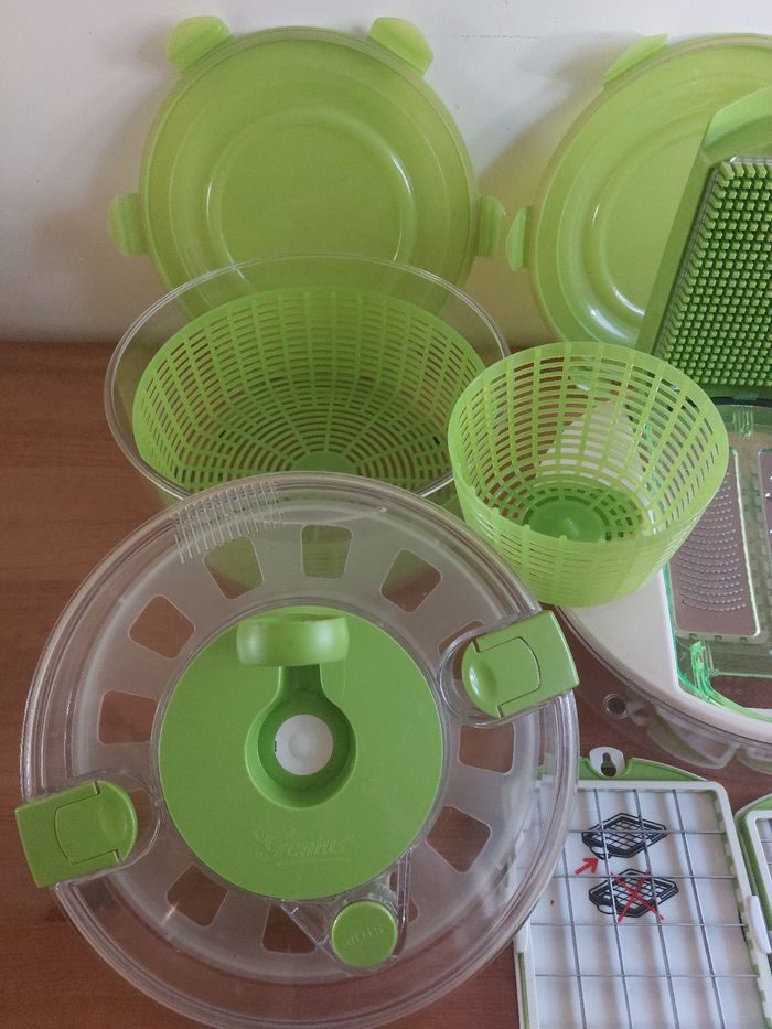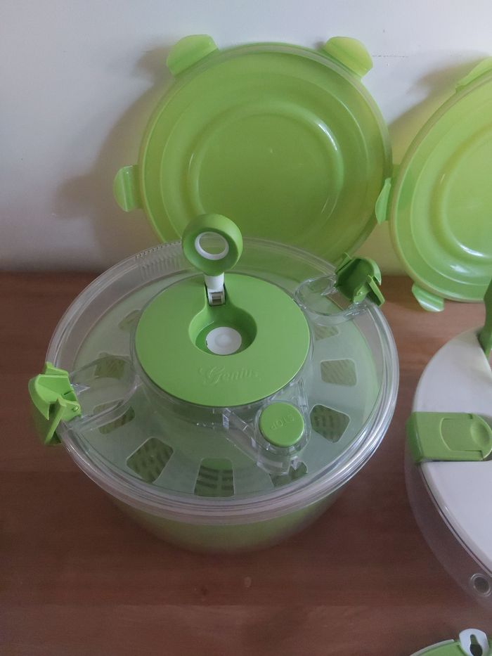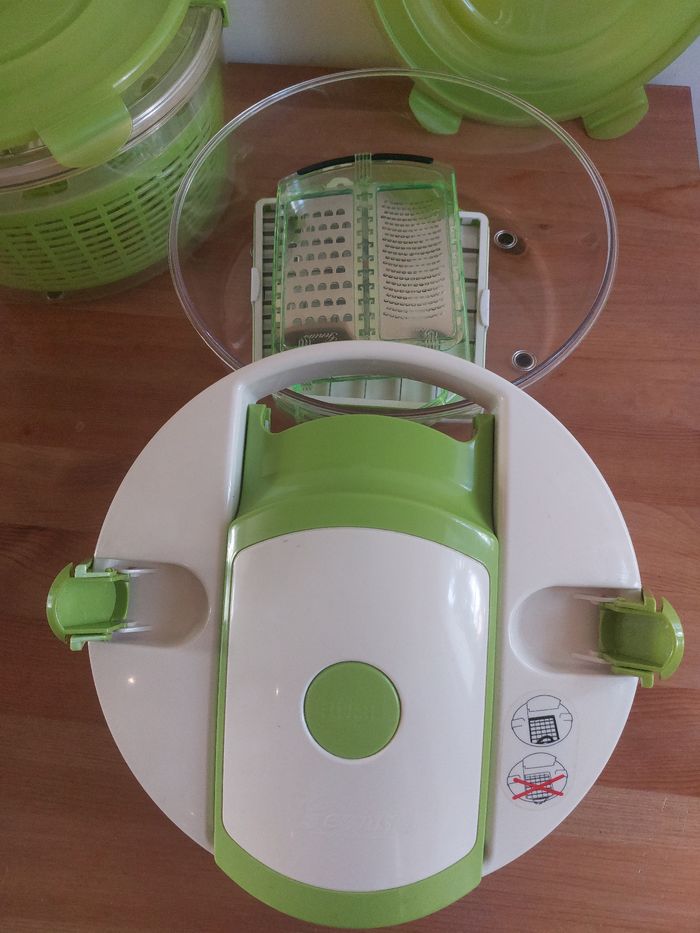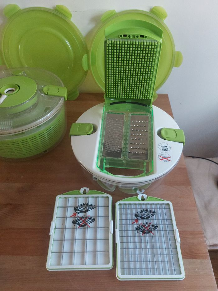 Vend set de cuisine complet de la marque Genius. C’est l’outil tout-en-un idéal pour préparer, découper, essorer, servir et conserver vos salades et crudités en un temps record. Le lot comprend tous les accessoires d'origine : Système de découpe : Couvercle avec grille de découpe "Push" pour faire des cubes ou des bâtonnets instantanément. Essoreuse à salade : Grand bol transparent avec panier rotatif vert et son couvercle spécifique muni d'un bouton "Stop". Conservation : Couvercle hermétique supplémentaire (vert) pour conserver vos préparations directement au réfrigérateur. Bol de préparation : Grand récipient haute résistance. Points forts : Gain de temps incroyable pour les salades, ratatouilles ou macédoines. Tous les accessoires sont présents et en excellent état car jamais utilisé. Facile à nettoyer.