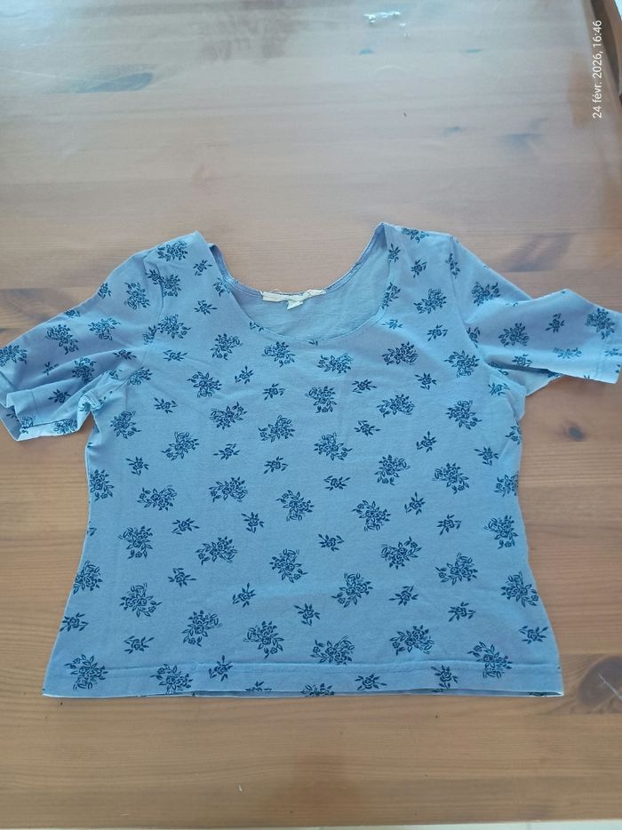 Je vends ce top femme aux motifs floraux délicats. Une pièce légère et confortable, parfaite pour les beaux jours. - Type de produit : T-shirt / Top - Univers : Femme - Taille : 36 - S - Couleur : parme avec motifs floraux - Caractéristiques : Manches courtes, Col rond N'hésitez pas à me contacter pour plus d'informations ou de photos.