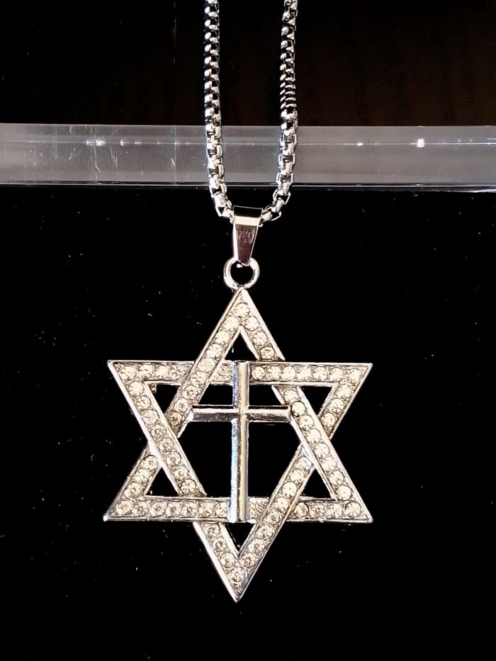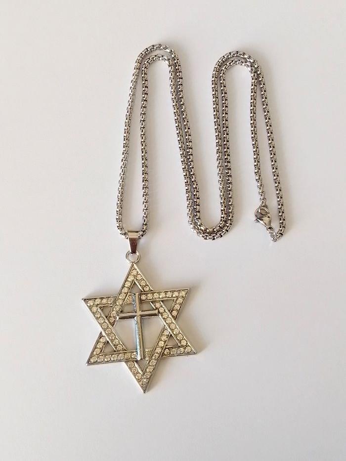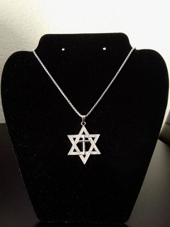 Chaîne + pendentif religieux. Pendentif : hexagramme, croix, strass. (religieux, protection, spirituel, celtique, idéal cadeau) DESCRIPTIF : Couleur : argenté. Taille chaîne : 60 cm Diamètre pendentif : 3,7 L * 4,7 cm H Envoi rapide et soigné.
