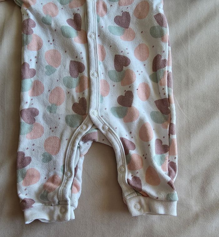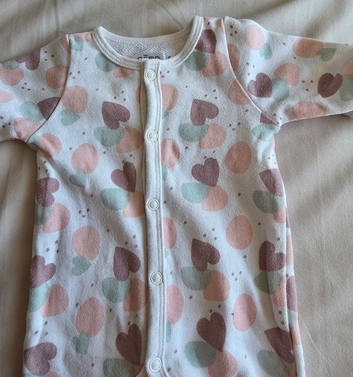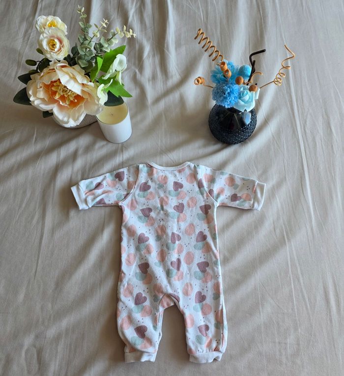 ​✨ ÉTAT : Très bon état général. À noter une toute petite tache sur le bouton du haut, qui ne se voit que de très près. Le reste du pyjama est impeccable, sans bouloches ni jaunissement. ​📏 TAILLE & COUPE : Taille 0 / Naissance. Ouverture intégrale par pressions sur le devant pour un habillage facile. ​🌿 MATIÈRE : Coton molletonné doux et confortable. Joli imprimé cœurs et pois multicolores (rose, vert, marron). ​📦 LIVRAISON : Envoi via Mondial Relay (lockers), Shop2Shop ou Chronopost (point relais physique). ​🎁 Réductions sur les lots activées ! C'est le moment de compléter votre trousseau de naissance.