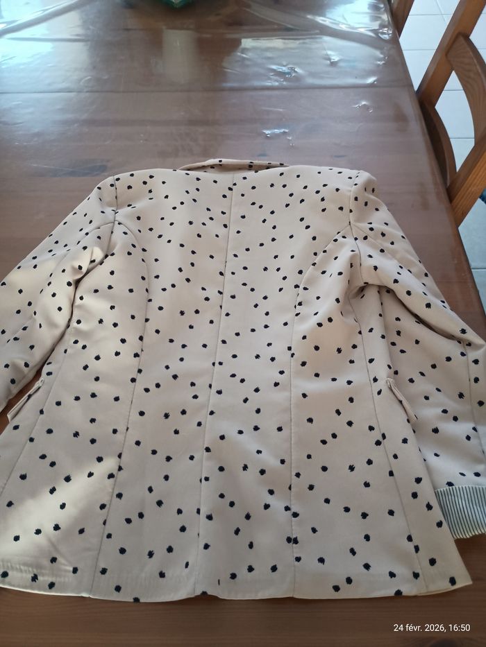 Je vends cette veste blazer femme aux motifs à pois noirs sur fond crème. Une pièce intemporelle et élégante, parfaite pour structurer vos tenues au quotidien ou en occasion. - Type de produit : Veste blazer - Univers : Femme - Taille : noté M sur l'étiquette mais taille petit et cela correspond plus à du 36 - S - Couleur : Crème / Blanc cassé avec pois noirs - Caractéristiques : Manches longues, Poches latérales, Doublure rayée, Boutons de fermeture N'hésitez pas à me contacter pour plus d'informations ou de photos.