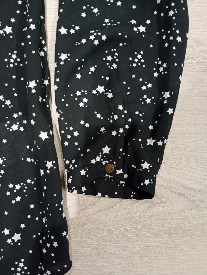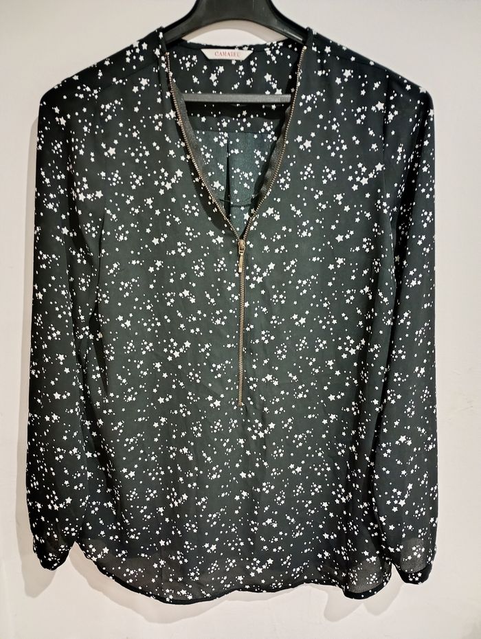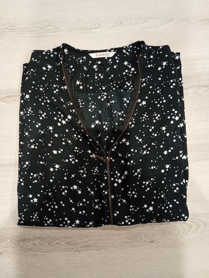 Je vends ce joli chemisier de la marque Camaïeu, en excellent état. C’est une pièce fluide et légère, idéale pour un look de bureau élégant ou une sortie décontractée. Taille : 38 (M) Couleur : Noir avec petits motifs Coupe : Coupe fluide avec un col Manches : Manches longues Détails : Finition travaillée au niveau de la boutonnière, bas arrondi pour un joli tombé État : Très bon état, peu porté
