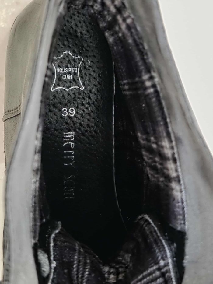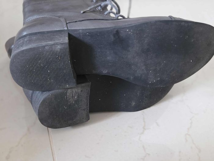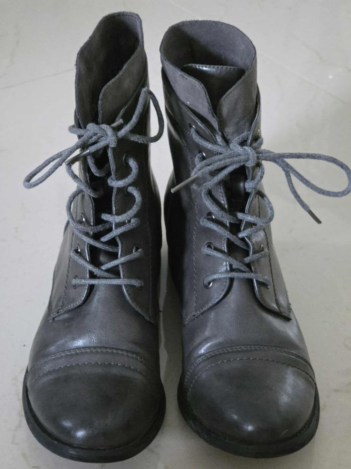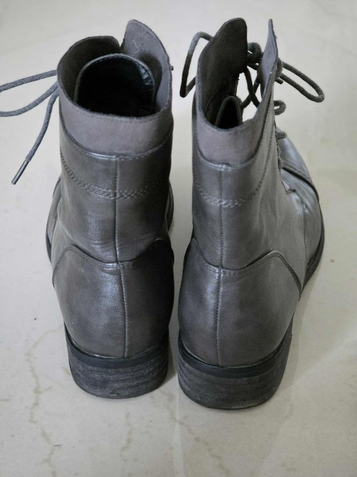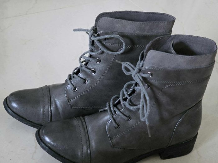 bottines montantes à lacets première cuir extérieur en simili cuir de qualité gris marbré doublure intérieure coton flanelle talons 3 cm très bon état car peu mises