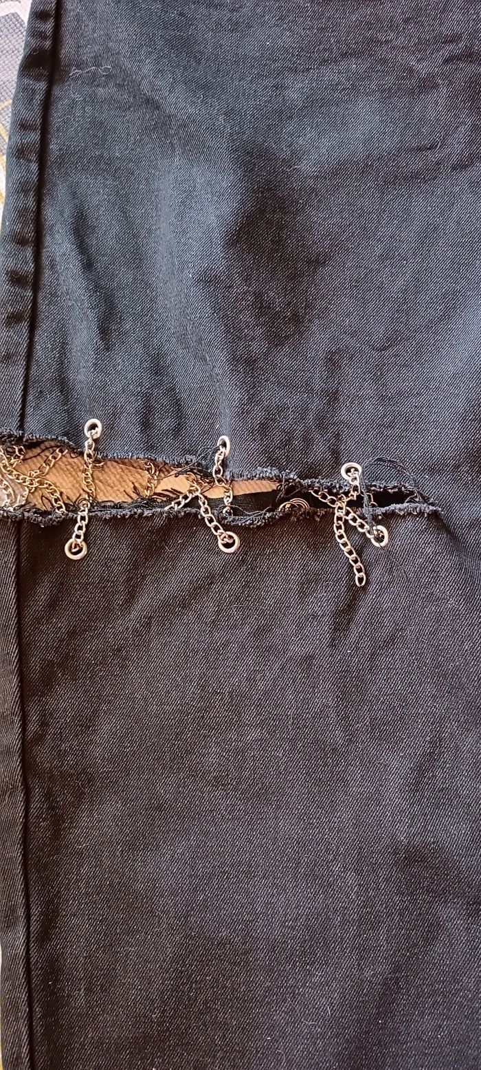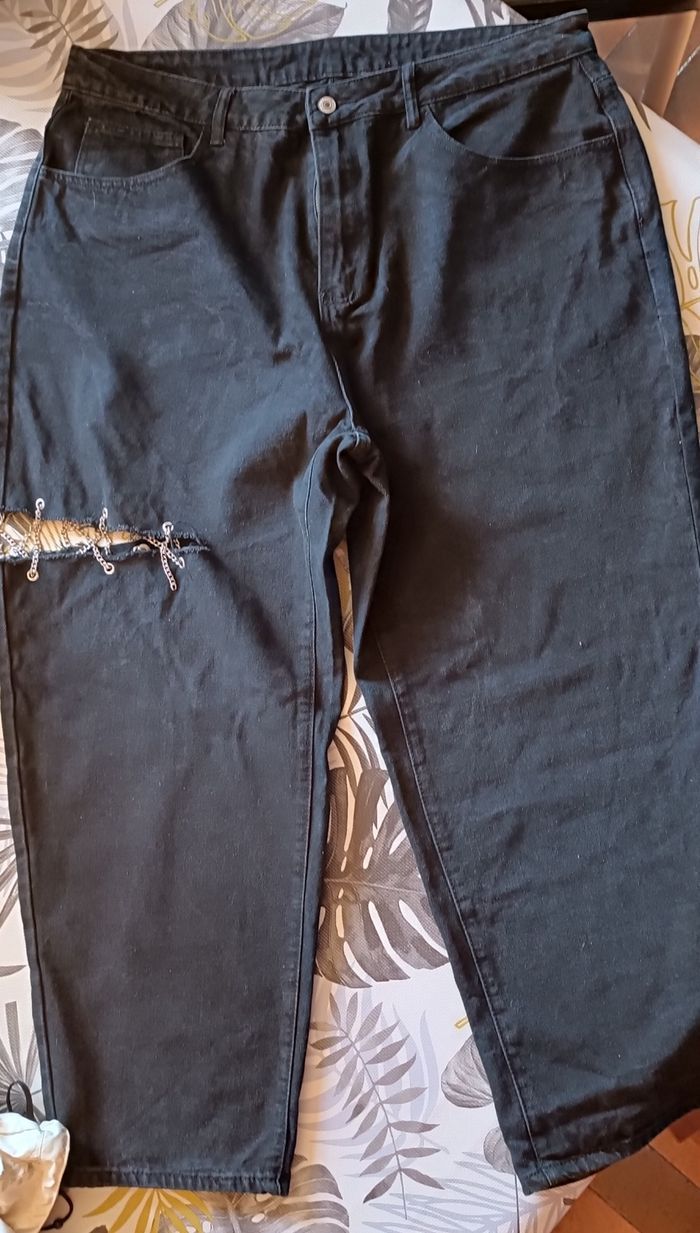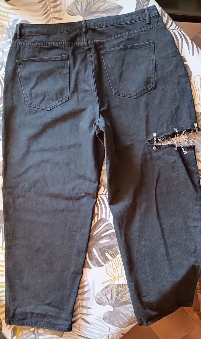Jean noir grande taille 4XL Coupe droite inspiration Mom Confortable avec belle ampleur Denim souple facile à porter Taille haute Fermeture glissière et 1 bouton, Détail fort sur la cuisse : ouverture horizontale bord brut ornée d'une chaîne métallique fixées par œillets. La chaîne bouge légèrement et donnent un vrai caractère à la pièce. Style clairement grunge / rock / goth, parfait avec rangers, boots massives, t-shirt noir, résille ou veste en cuir. Une pièce affirmée, idéale pour un look alternatif assumé tout en restant confortable 80%coton 20%polyester Longueur 103cm Longueur fourche avant 36cm largeur taille 49cm largeur hanche 65cm largeur cuisse 38cm largeur bas de jambe 22cm #grandetaillefemme #grandetaillexxxl #taillehaute #taillehautegrandetaille #momcurves #jeansgrandetaille #jeanstroué #Jeanstrouegrandetaille #destroy #grungegrandetaille #grunge #grungestyle #grungefashion #goth #gothstyle #gothgrandetaille #gothcurvy #gothfashion #gothvibes #rock #rockcurvy #rockgrandetaille #rockstyle #rockfashion #alternativestyle #alternatinecurve #alternativefashion #darkstyle #darkaesthetic #punkstyle #punk #punkrock #punkcurvepants #undergroundfashion #metalstyle #streetgoth #edgylook #rebellestyle #chaines #jeannoir #denimrock #modealternative