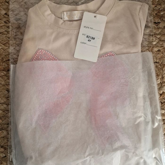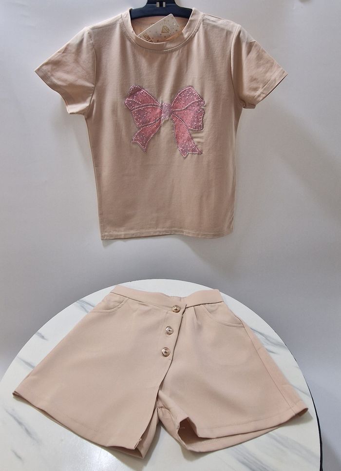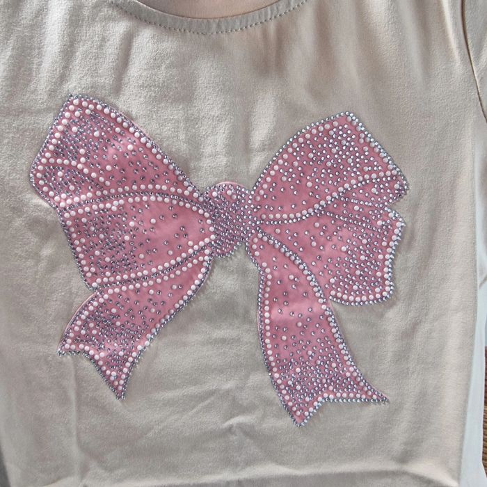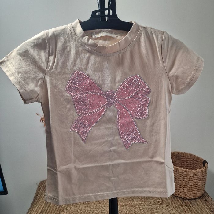 Tee shirt neuf jamais porté dans l'emballage d'origine. Motif noeud avec strass et perle 95% coton très agréable a porter Possibilité d'assortir avec jupe short beige ( ou blanc)