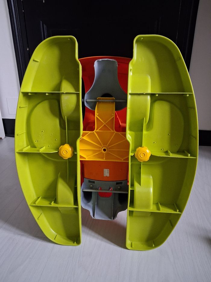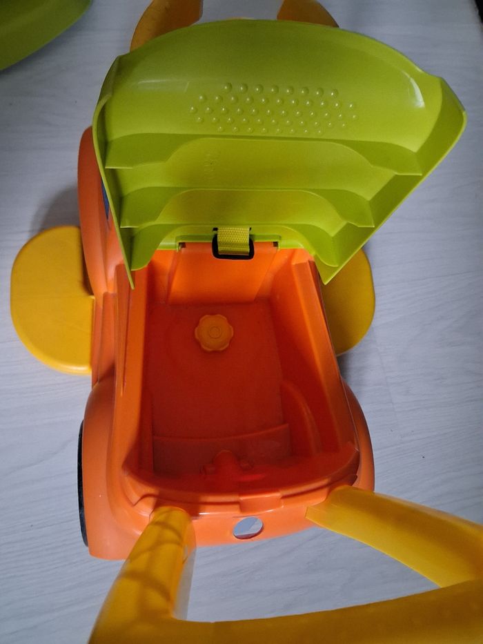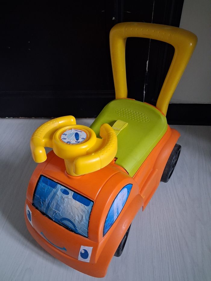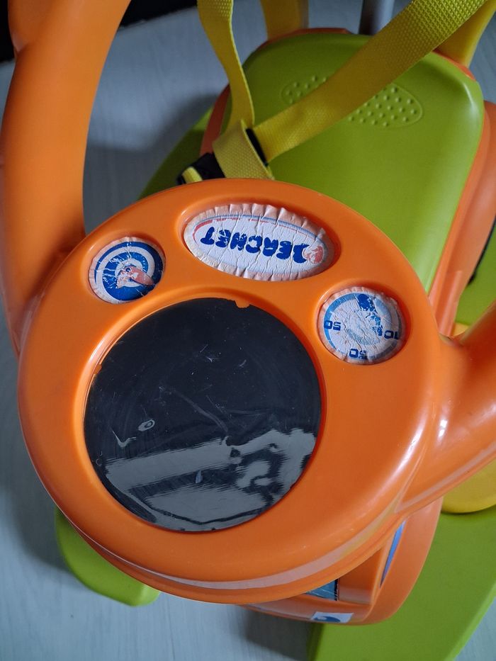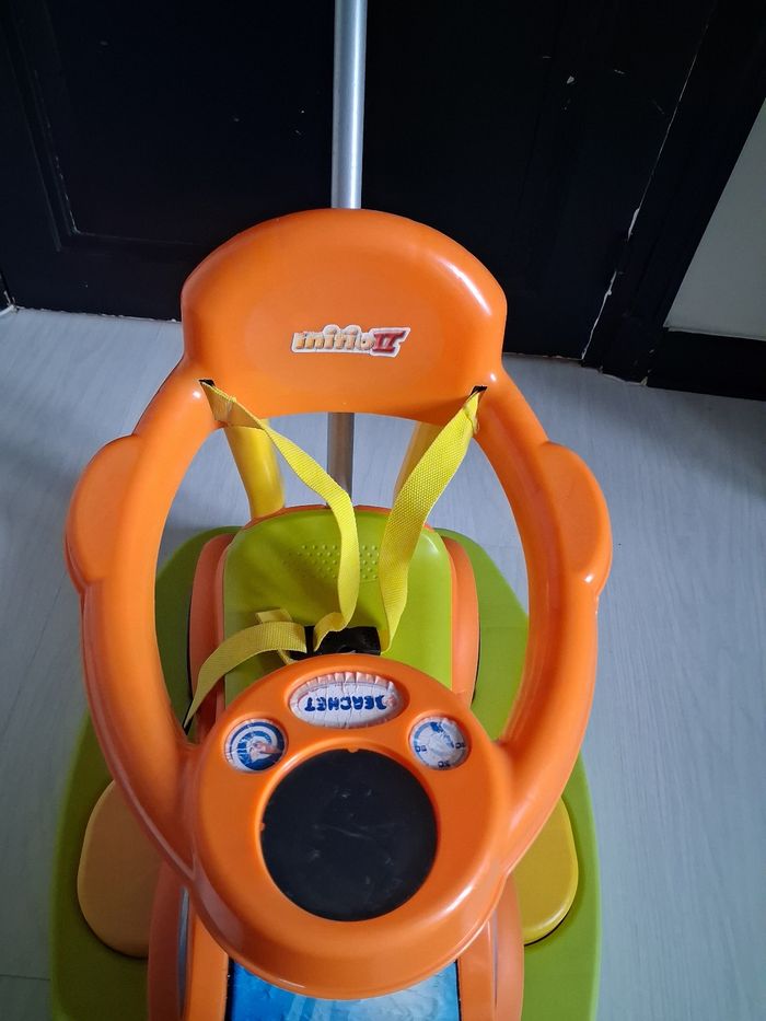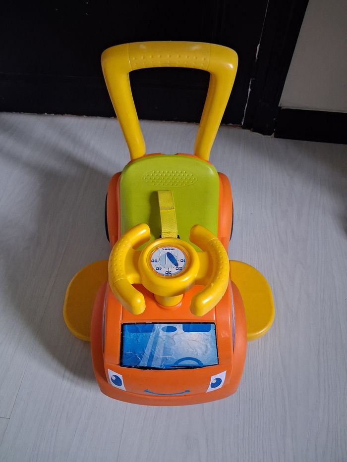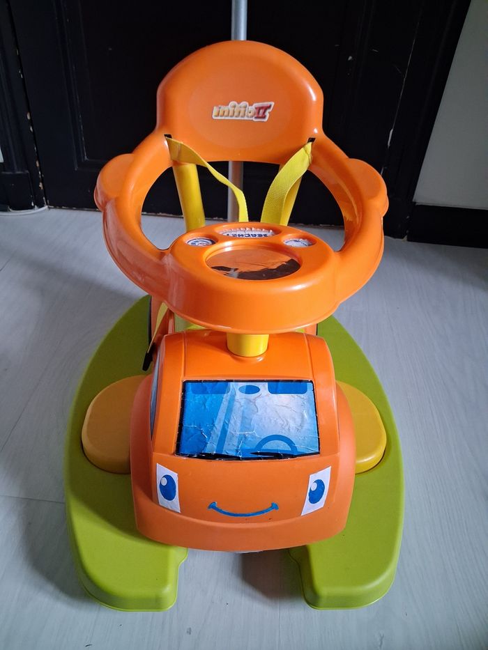 Porteur évolutif 4 en 1 Marque BERCHET A partir de 12 mois 1 et 2 : Bascule avec son arceau de sécurité où sans selon l'âge 3 : Promenade avec ses repose pieds et sa canne 4 : Porteur : Avancer en poussant avec ses pieds Ceinture de sécurité Coffre de rangement ( siège) Volant pour direction Canne amovible ( 3 niveaux) Très très bon état juste légère imperfections sur les autocollants ( voir photo)
