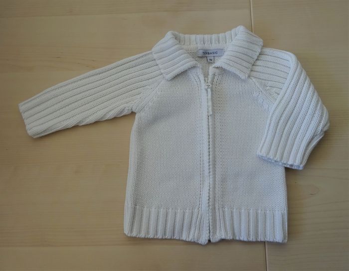 Gilet blanc en maille Tex 3 mois Col camionneur / Fermeture éclair Excellent état / Porté une seule fois Possibilité vente au détail ou lot avec mes autres articles