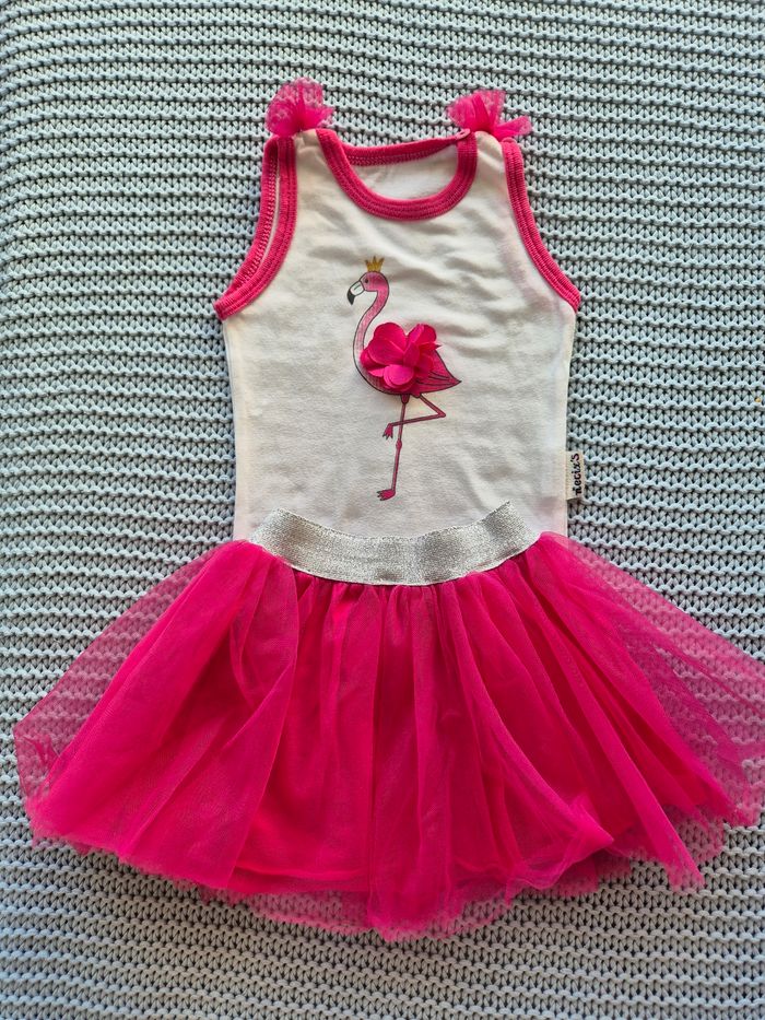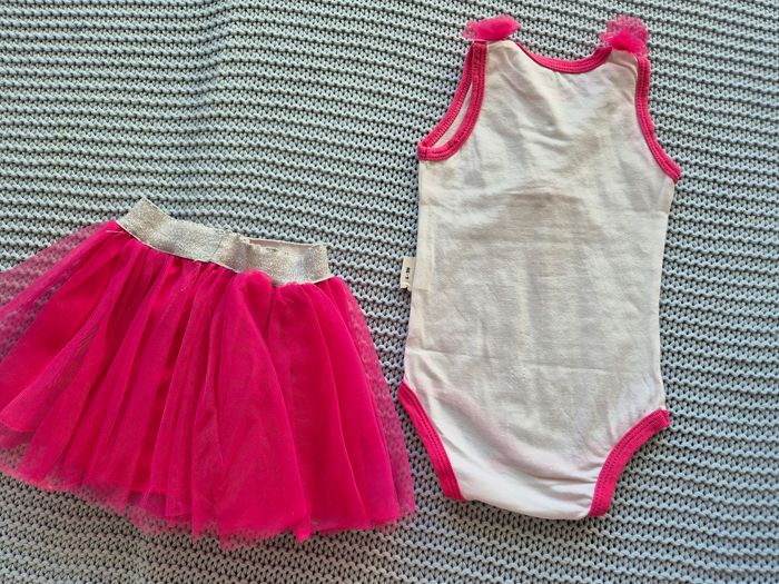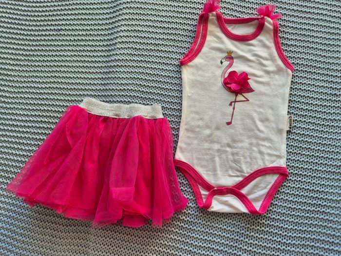 Ensemble composé d'un body blanc et rose avec dessin de flamant rose et nœuds en tulle sur les épaules et d'une jupe tutu à taille élastique argenté. Souvenir de Punta Cana. Taille 6mois. #mimidacfille #mimidacfille6mois