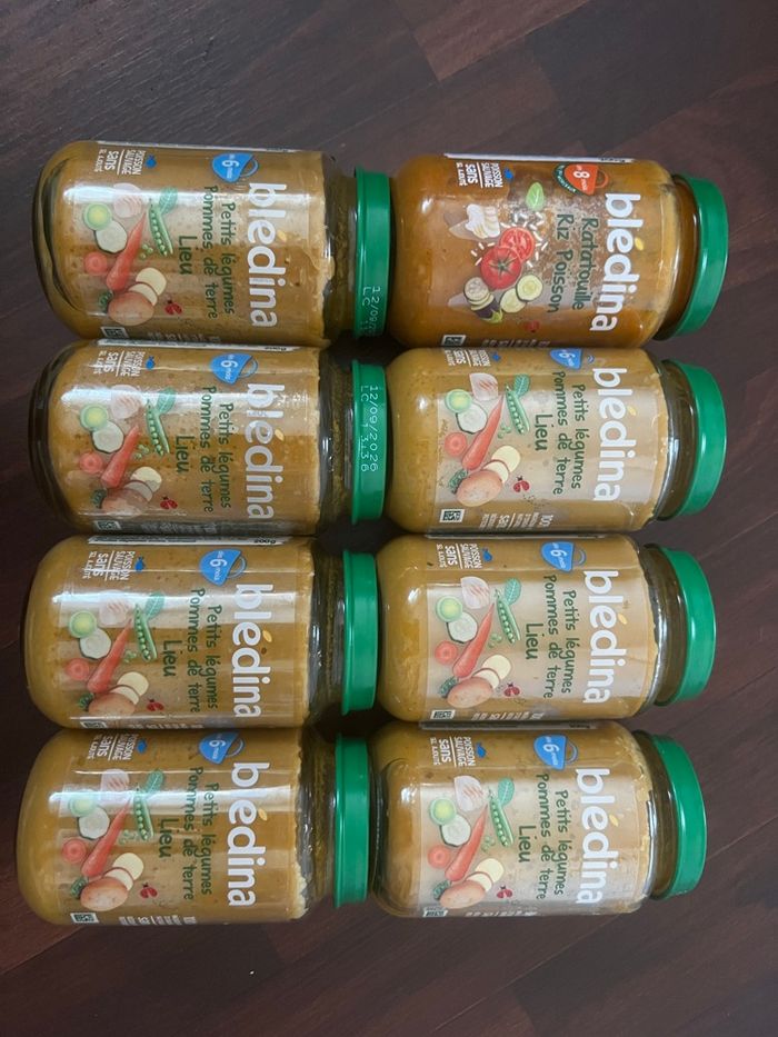 8 petites pots : 7 petites légumes, pomme de terre, poisson sauvage et un pot de ratatouille, riz et poisson ( 8 mois)