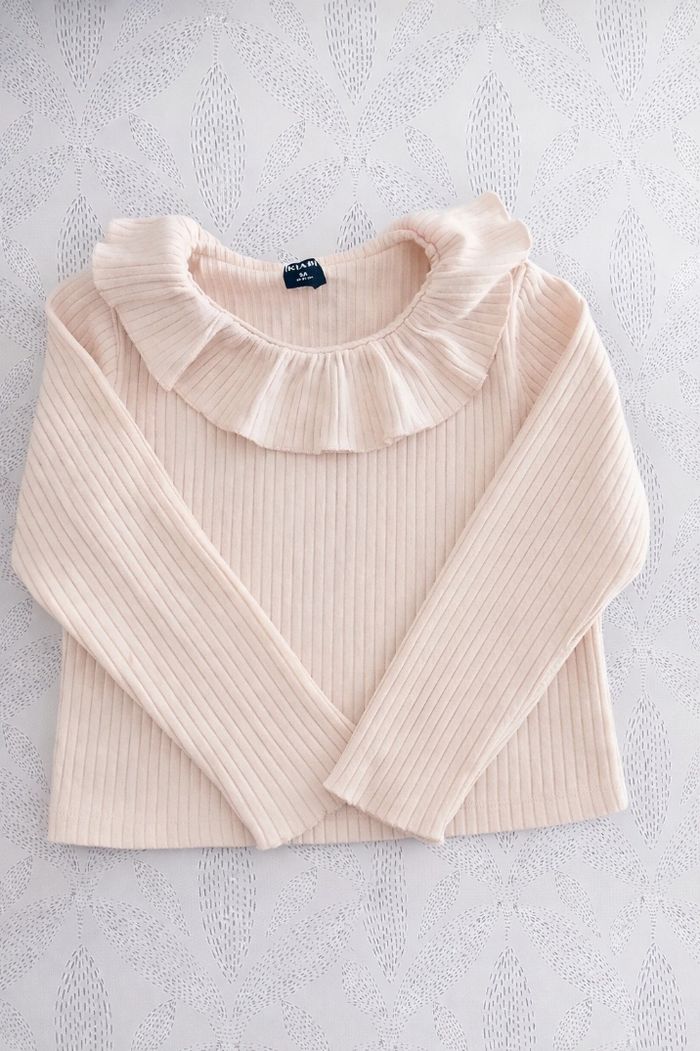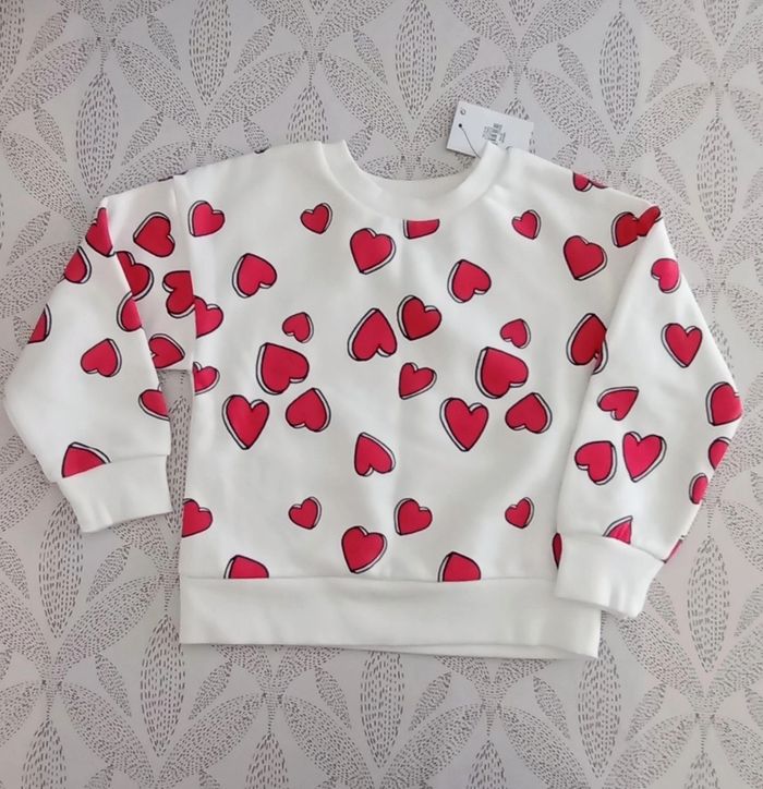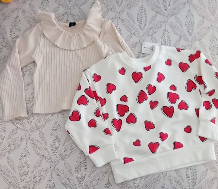 Lot de 2 hauts fille taille 3 ans : • Pull beige côtelé avec joli col volant, très bon état très peu porté. • Sweat blanc avec motifs cœurs . neuf Idéal pour la mi-saison