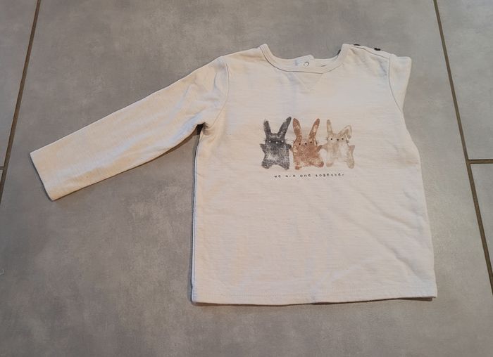 Pull léger, de couleur crème avec motifs, de la marque Kiabi, taille 24 mois (83-89 cm), en très bon état. Article lavé pour la vente.