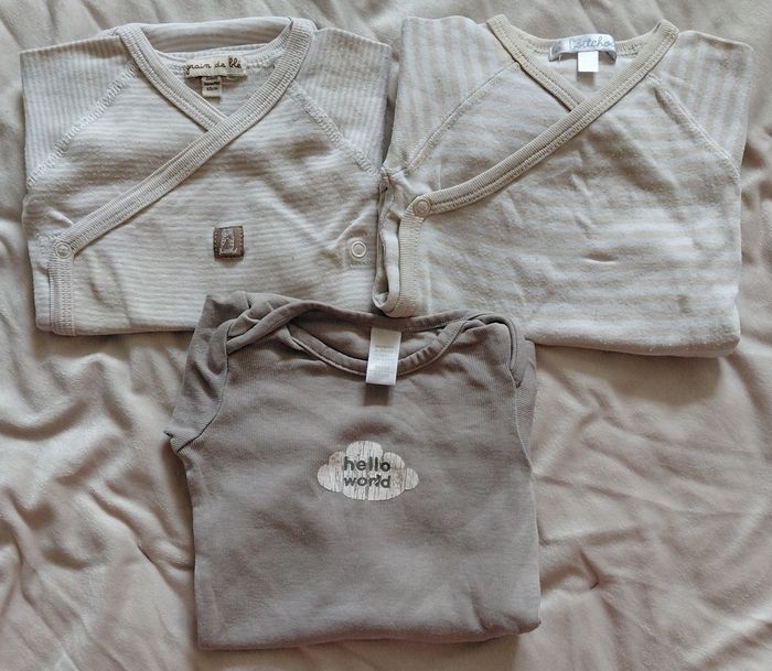 3 bodies/body manches longues garçon 3 mois. Le gris est légèrement taché sur la une manche(voir photos) - Type de produit : bodie/body - Taille : 3 mois / 60/68 cm - Marque(s) : grains de blé, kitchoun, Obaïbi - Couleur(s) : blanc/beige a rayures, gris Réductions de lots activée, jusqu'à -50%. Prix tout de même négociable sur les lots a partir de 15€ et dans la limite du raisonnable.😉