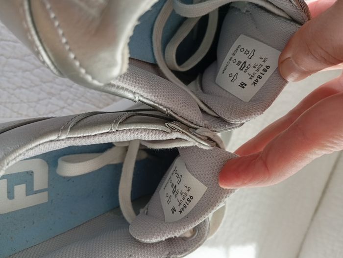 Remise sur lot activé. Chaussures de golf couleur argenté avec semelle et lacets blancs avec quelques petites marques dûes à son utilisation ( Merci de bien regarder toutes les photos)mais qui continuent en très bon état. Marque: FootJoy Pointure : 38 Mesures sur les photos 😊 Chaussures sans crampons Links Très agréables à porter sur les parcours et en dehors, les chaussures de golf femme Footjoy Links présentent un look casual qui pourrait laisser penser qu'il s'agit de baskets classiques. Elles sont conçues avec une tige en cuir imperméable. La semelle intérieure légère en polyuréthane FitBed® offre un confort accru et un meilleur soutien du talon. #chaussuresdegolffemme #chaussuresdegolf #chaussuresdegolfargentes #chaussuresdegolf38 #chaussuresdegolffootjoy #footjoygolf #footjoygolf38
