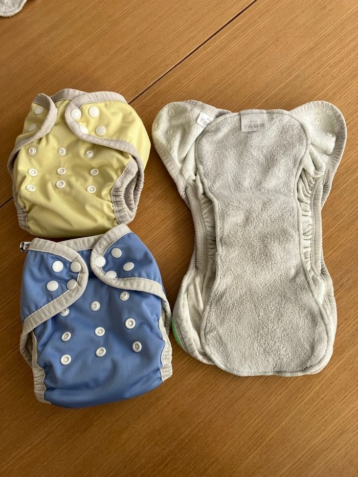 Lot de 3 couches lavables TE1 en bambou de marque française b’bies Vendues avec leurs inserts clipsables Taille ajustable de la naissance a la propreté 5€ la couche avec insert Routine de lavage : prélavage à 30 degrés puis cycle long à 40 avec lessive en poudre spéciale couches, de la marque « comme avant » Décrassage occasionnel (elles ont été décrassées pour la vente notamment)