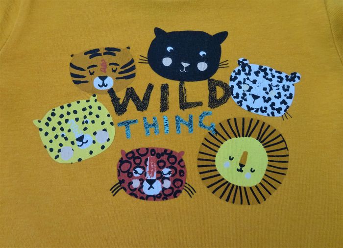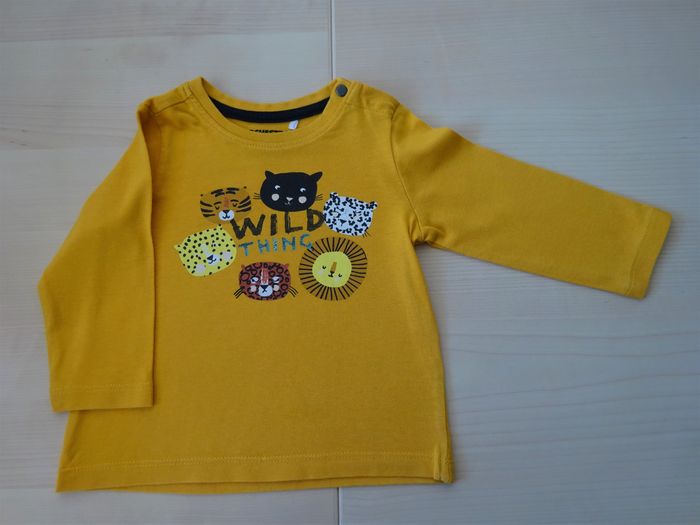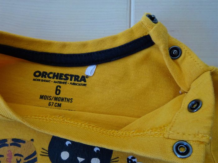 T-shirt manches longues Orchestra 6 mois Couleur jaune moutarde avec motif têtes d'animaux félins à l'avant Fermeture par 2 boutons pression à l'épaule gauche Excellent état, peu porté Possibilité vente au détail ou lot avec mes autres articles