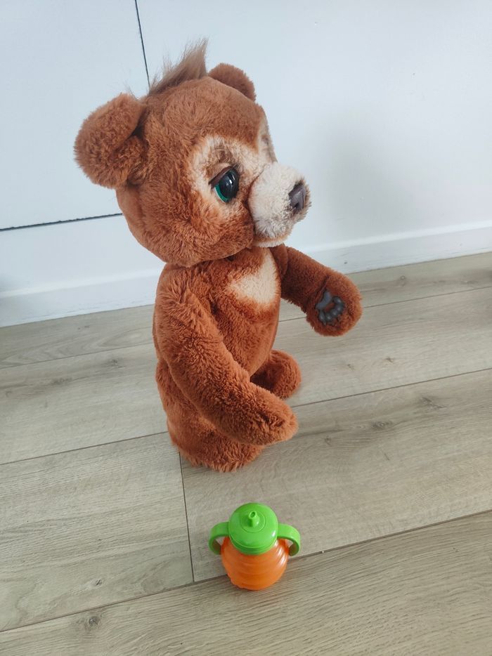 Vends Cubby ourson curieux En très bon état Cubby L'ours curieux de furReal est le compagnon rêvé des enfants à partir de 4 ans : il participera à toutes les aventures que lui proposeront les enfants, après quoi il fera une sieste près d'eux pour reprendre des forces. Jeune ourson curieux, il est impatient qu'on le prenne pour lui donner des câlins, car il en donne en retour ! Il joue aussi à faire coucou, et il lui arrive même de danser ! Et n'oublions pas l'heure de la collation ! Il suffit de lui donner son biberon ou une friandise pour qu'il fasse des bruits de déglutition. Cubby aime aussi parler : il babille quand on lui parle. En mode sieste/nuit, cet ourson mignon ferme les yeux, fait des bruits d'ours qui s'endort et joue une des quatre séquences de 5 minutes de musique douce. Fais de beaux rêves Cubby ! Ses yeux, son museau et sa bouche mobiles rendent son visage expressif. Voilà un ourson tout à fait mignon !