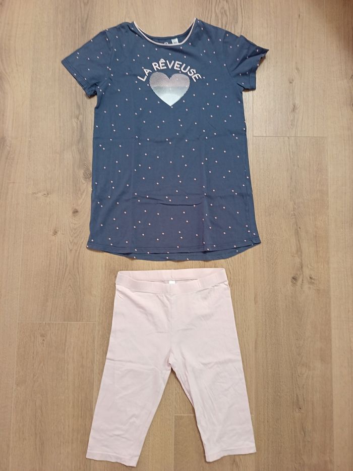 Ensemble pyjama. Haut manches courtes avec motif, bleu avec pois roses. Bas longueur genoux rose pâle.