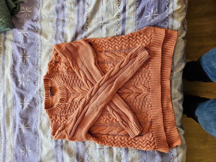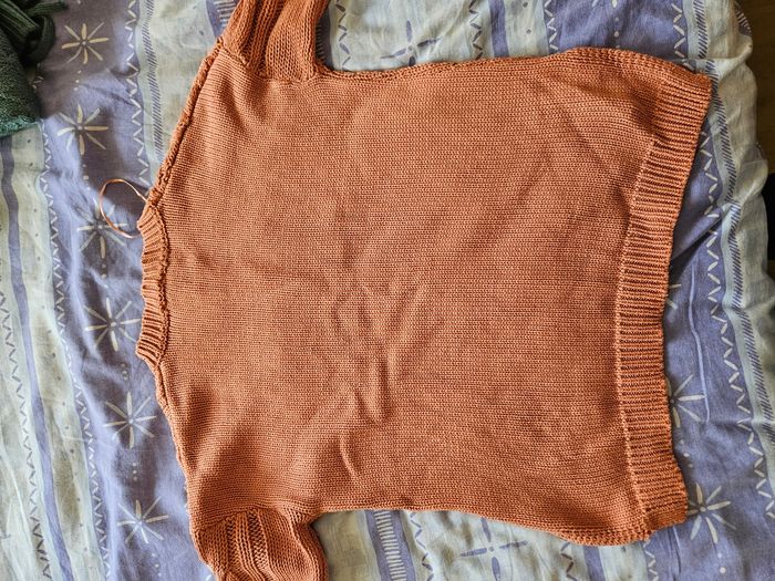 Pull torsadé sur le devant et manche, derriére maille simple. Le derriére est plus grand que le devant
