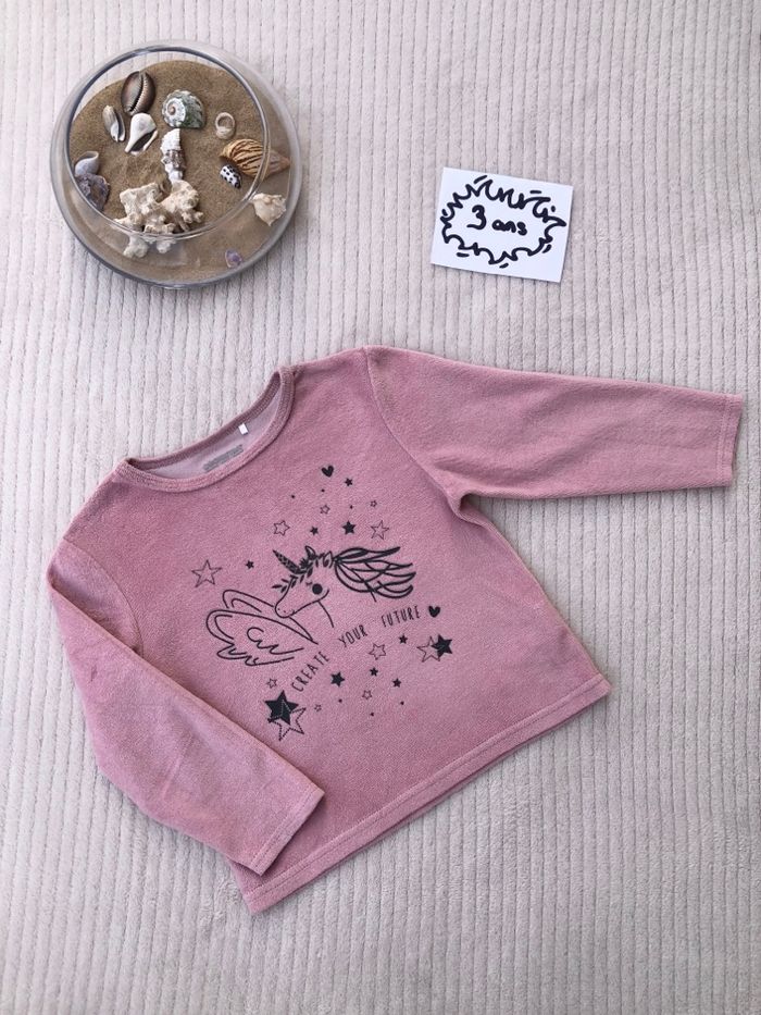 Pyjama en velours, deux pièces, motif licorne, inscription ´ create your future ´, 3 ans (98 cm), très bon état (hormis une petite ombre sombre visible que de très près - cf photo), vêtement de premières mains, Orchestra. 🛍 Dressing trié par taille, les catégories sont accessibles à partir de mon profil ! Bon shopping ! #fille3ansnikita40000