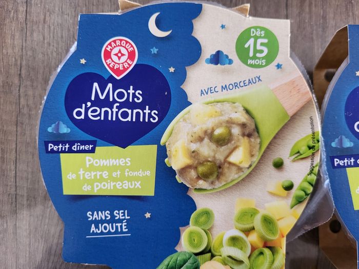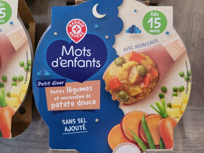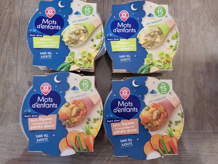 A vendre lot de 4 repas de nuit pour bébé a partir de 15 mois 2 pommes de terre et fondue de poireaux qui se périmes le 08/08/2026 2 petits légumes et mousseline de patate douce qui se périmes le 03/07/2026