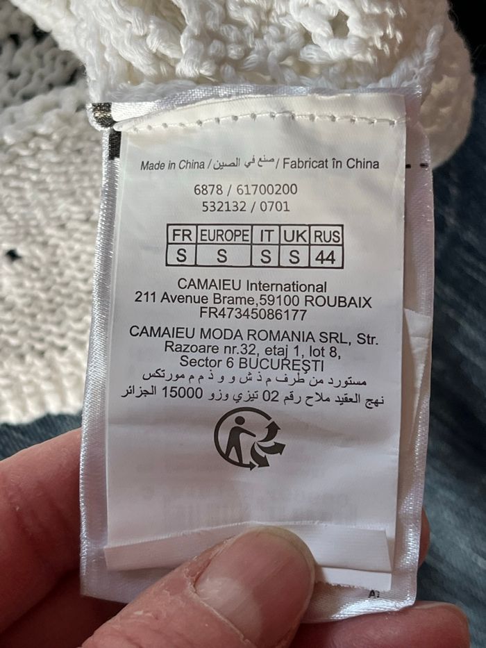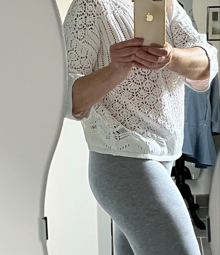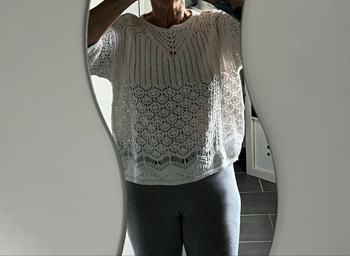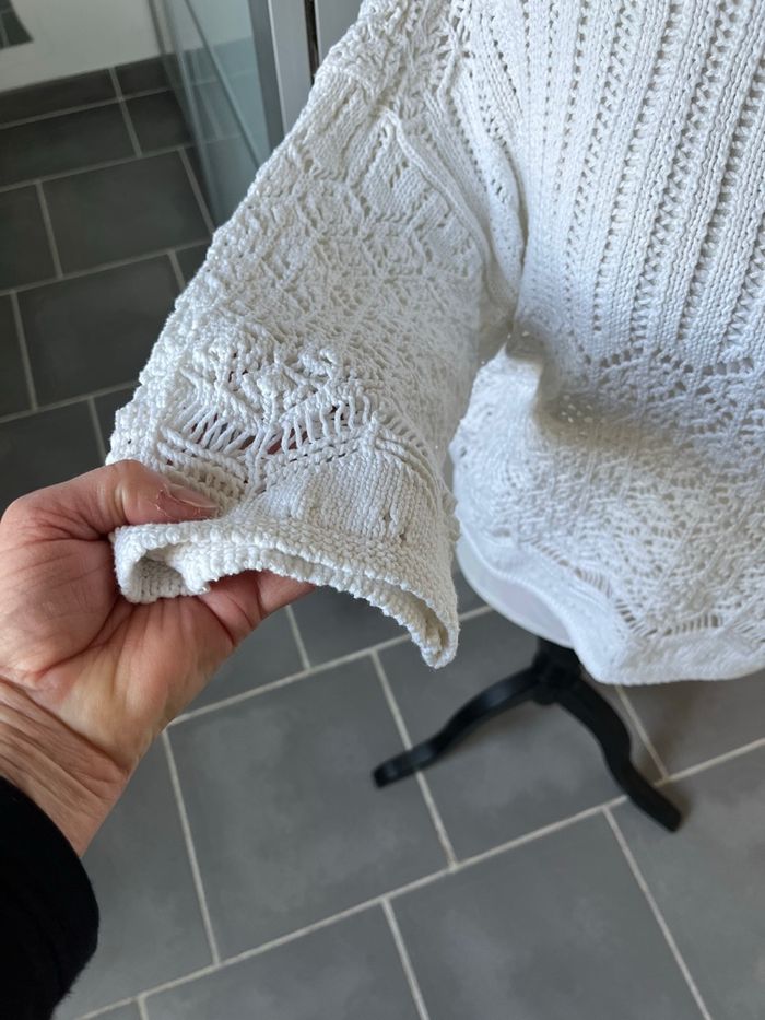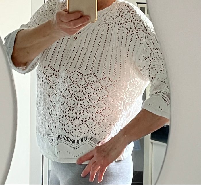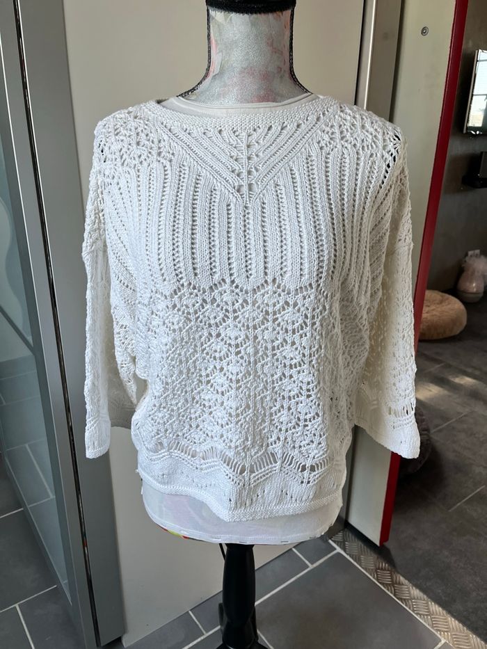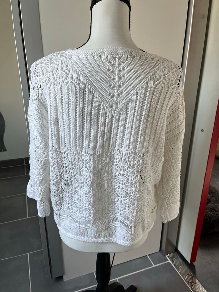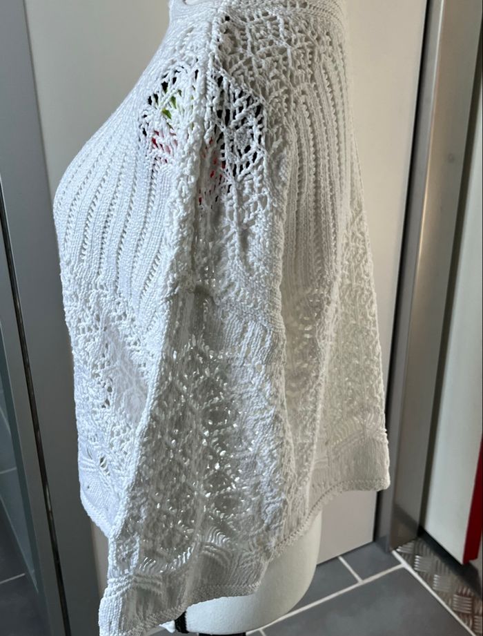 joli petit pull en mailles ajourées blanc cassé comme neuf, taille indiquée S 36 mais convient mieux à un 38 taille grand aisselle à aisselle 54 cms longueur 54 cms