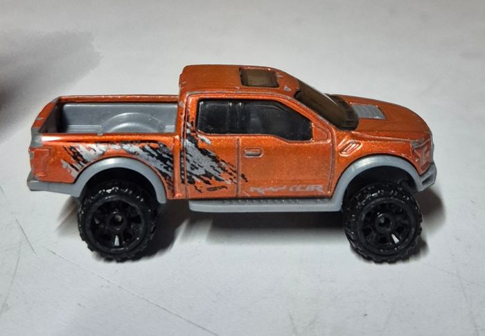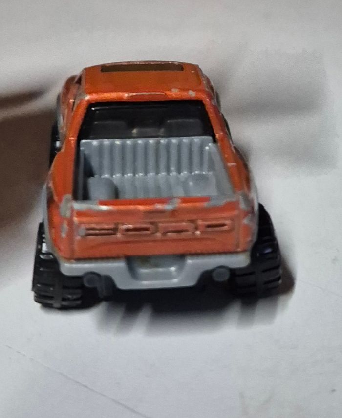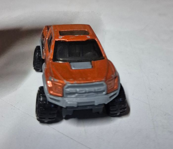 Modèle réduit Hot Wheels ’17 Ford F‑150 Raptor, carrosserie orange métallisé avec décorations noires et grises “RAPTOR”. Calandre avant marquée FORD, benne grise et roues tout‑terrain noires. Vitrages teintés et détails fidèles au design du Raptor. Châssis estampillé ’17 Ford F‑150 Raptor, fabrication Indonésie, ©2015 Mattel. Modèle présentant des traces d’usage : peinture écaillée, frottements et usure générale Etat conforme aux photos