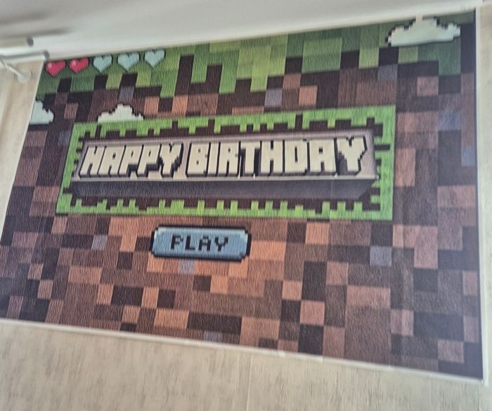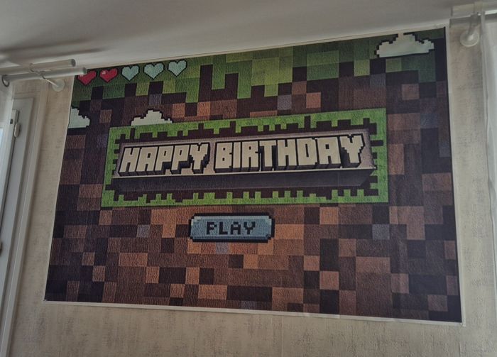 Grande bannière d’anniversaire thème Minecraft, dimensions 150×100 cm. Design pixelisé type jeu vidéo avec texte “Happy Birthday”, cœurs de vie et bouton “Play”. Impression couleur sur toile fine, légère et facile à accrocher (punaises, scotch, ficelle…). Idéal pour décorer un mur, un buffet ou un fond photo lors d’un anniversaire enfant ou ado. Modèle en bon état général, juste 4 trous de punaise ( 1 sur chaque coin) #minecraft #anniversaireminecraft #decorationanniversaire #happybirthday #banniereanniversaire #decominecraft #gamingparty #150x100
