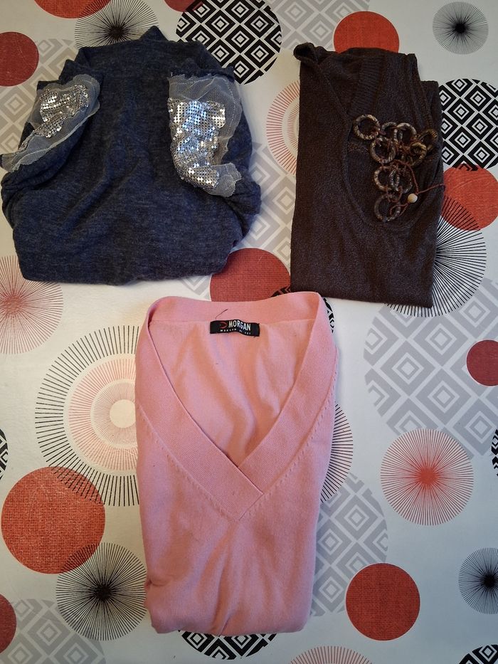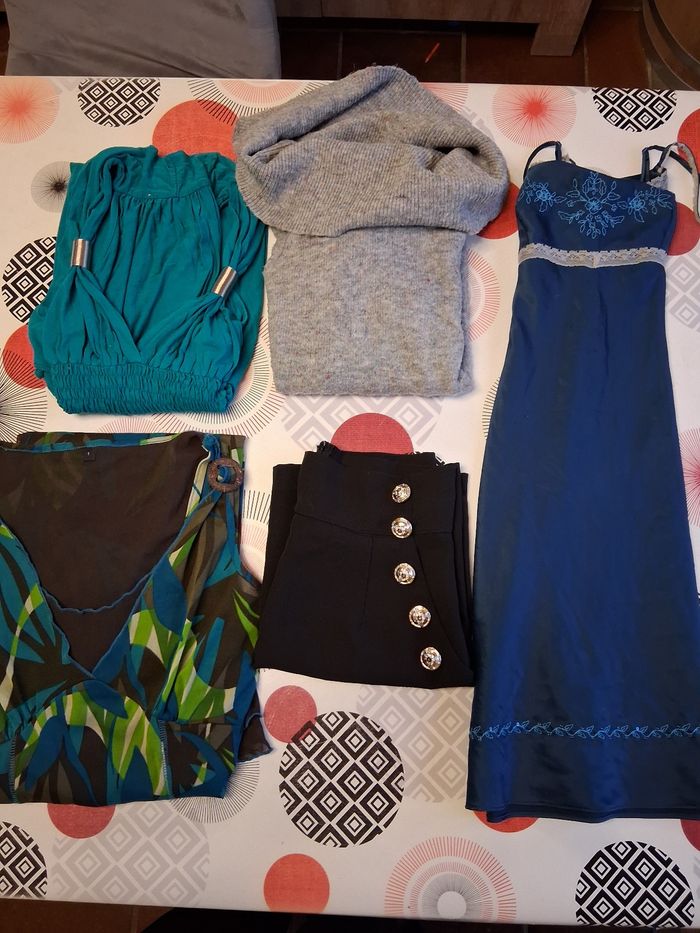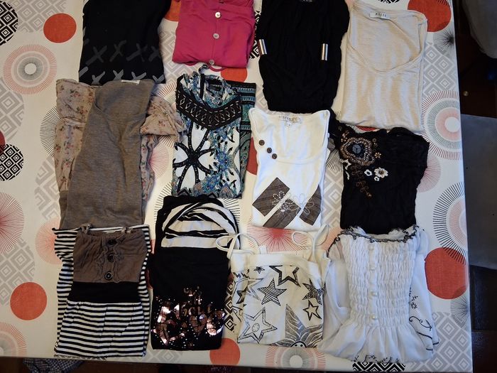 Lot 25 vêtements femme taille 36 -2 gilets -1 tee shirt manches 3/4 -3 pulls dont 1 sans manches (marron) -1 short -1 pantalon (usé au bout mais peut être recousu) -12 tee shirt sans manches (1 où la déco se décolle voir photo) -3 robes dont 1 robe pull sans manches (grise) -1 jupe -1 chemise de nuit