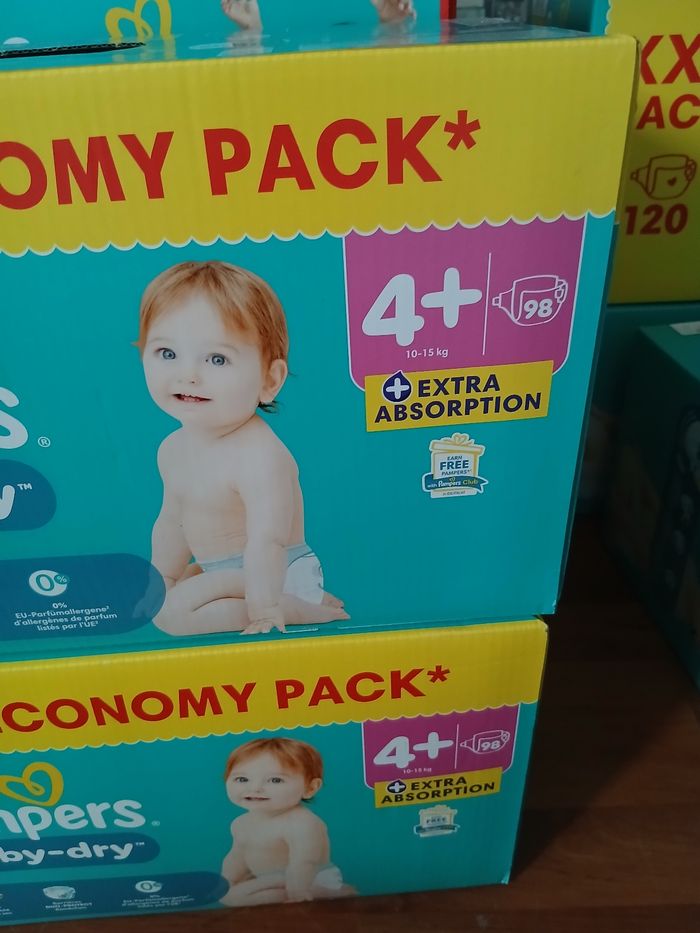 Lot de 2 cartons maxi pack couches pampers T4 plus 2×98 couches soit 196 couches 10-15kg Envoi rapide et frais de ports petits