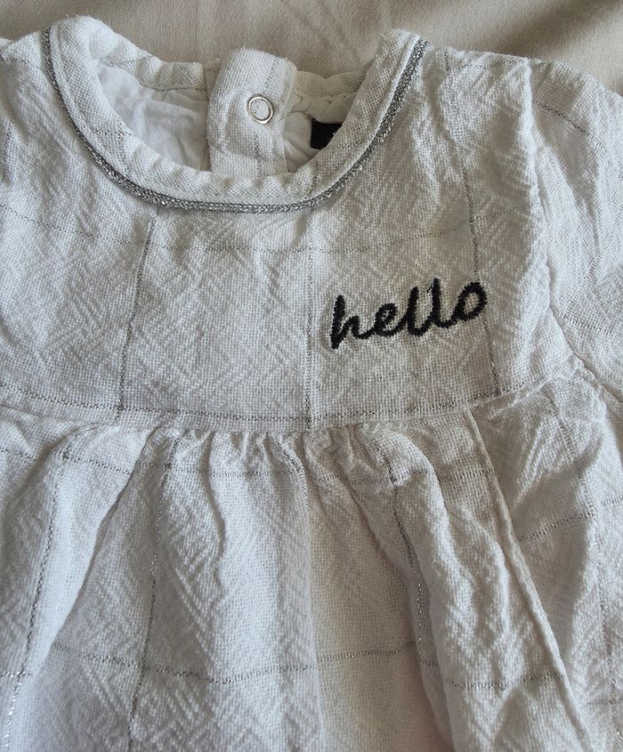 ​✨ ÉTAT : Très bon état. Le blanc est parfaitement éclatant. Les fils argentés et la broderie "hello" sont intacts. ​📏 TAILLE & COUPE : 3 mois (56-62 cm). Coupe évasée très confortable avec des boutons-pression sur toute la longueur du dos pour un habillage facile. Présence de deux petites poches discrètes sur le devant. ​🌿 MATIÈRE : 100% Coton. Tissu gaufré doux avec un motif à carreaux souligné par un fil argenté brillant. Doublure intérieure en coton pour un confort maximal. ​📦 LIVRAISON : Envoi via Mondial Relay (lockers), Shop2Shop ou Chronopost (point relais physique). ​🎁 Réductions sur les lots activées ! C'est le moment de compléter le trousseau de votre bébé.