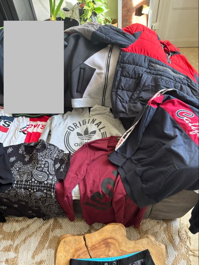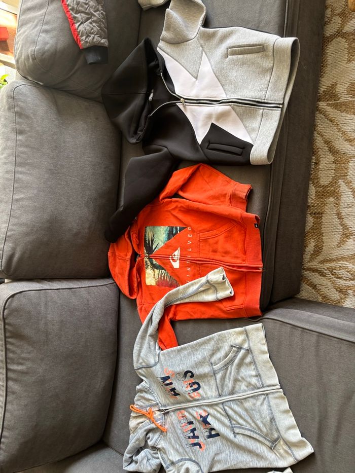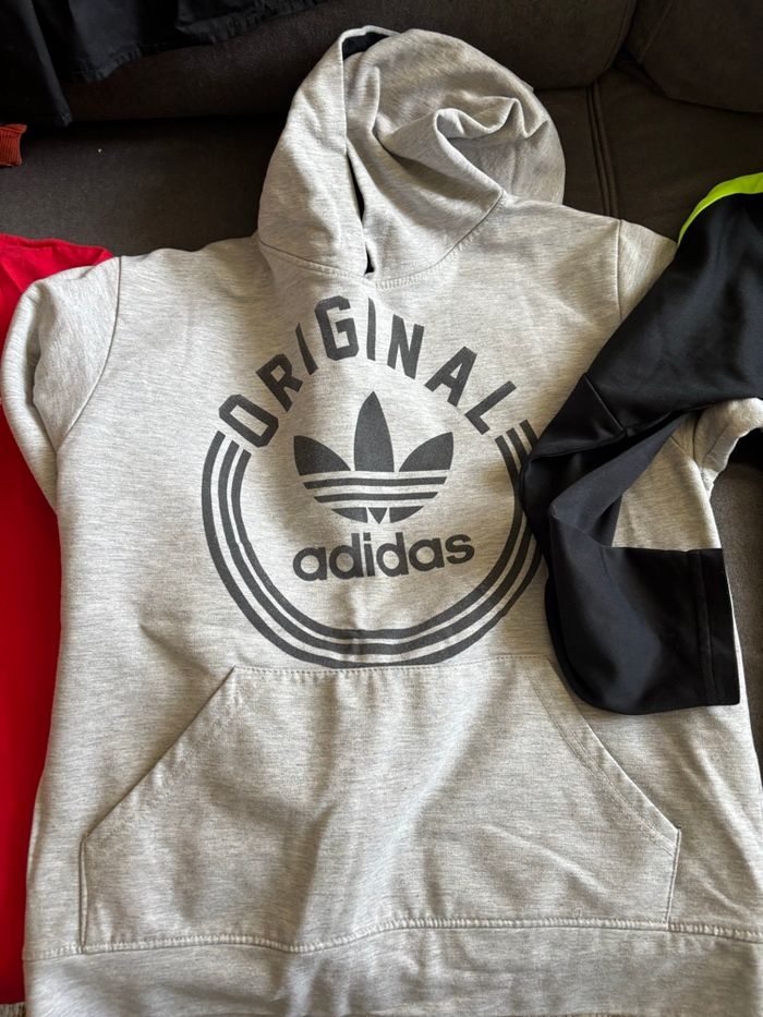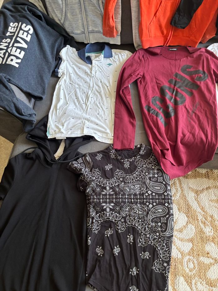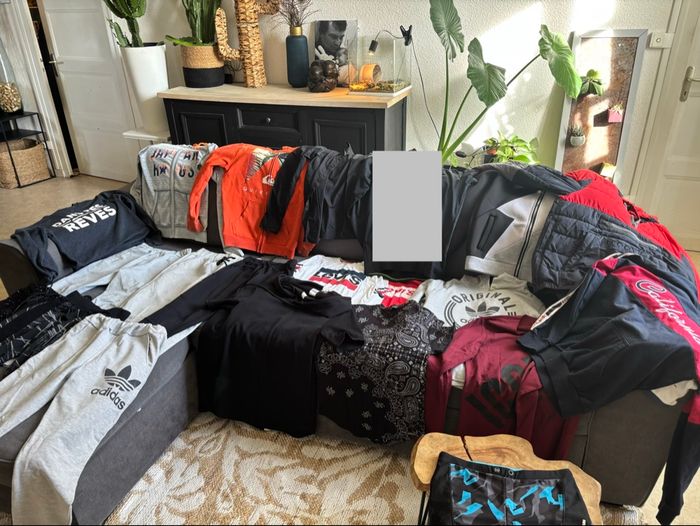 6 bas de survêtement ( léger défaut sur un) 1 blouson Teddy Smith, légèrement décousu sous les bras 3 veste à zip, Quicksilver, Japan rags… (léger défaut peu visible) 1. Chemise noire 1 shorty de bain Freegun 3 t-shirt manches longues 3 sweats 3 tee shirts #Adidas Teddy smith japan rags QuickSilver Lévis Petit prix en taille 12/14 ans