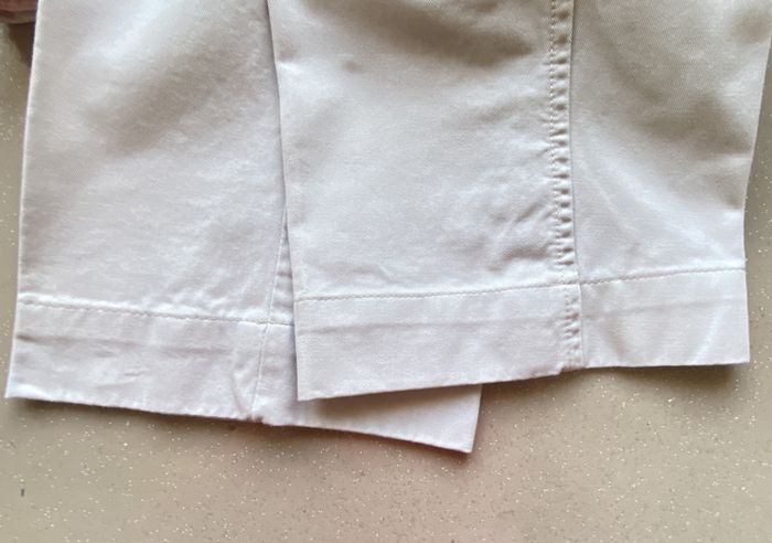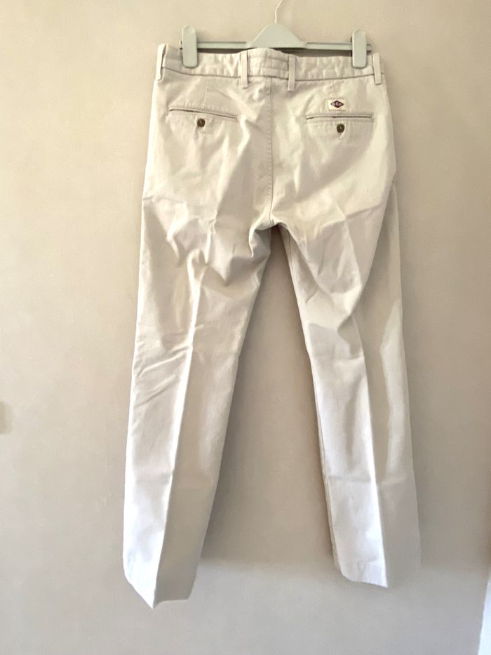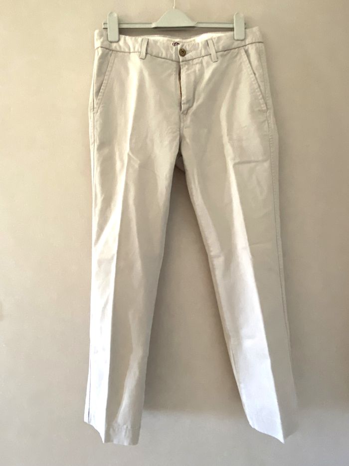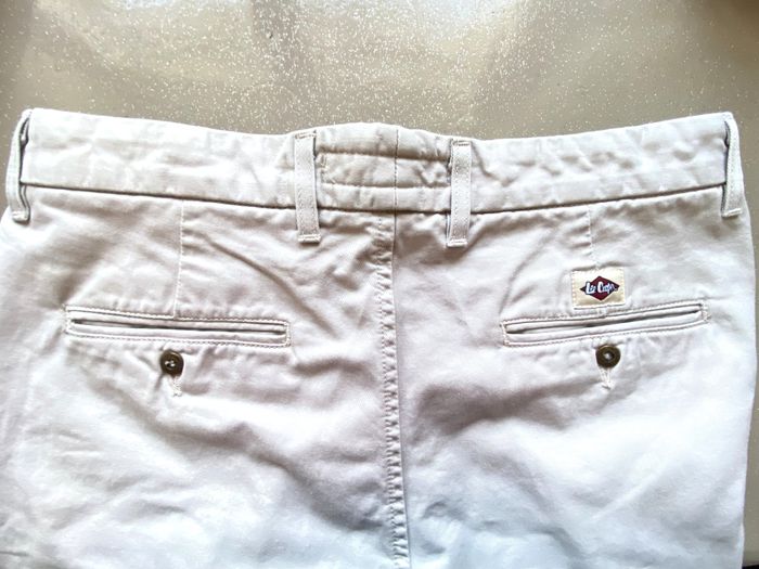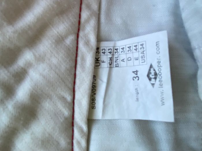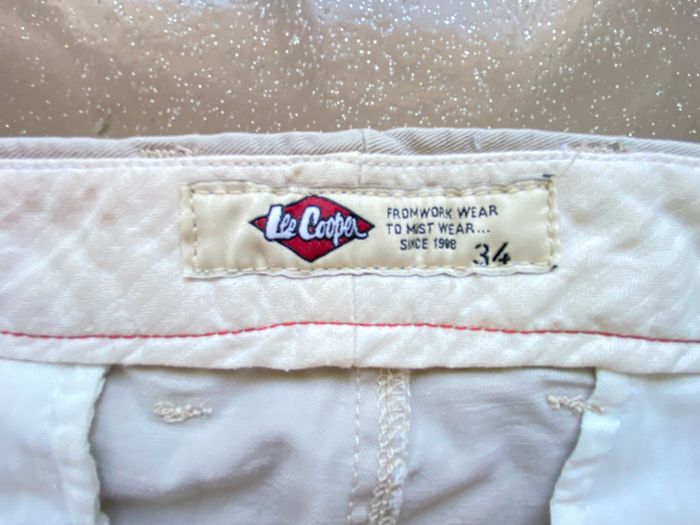 Pantalon coupe droite Lee Cooper Taille 44. 2 Poches latérales + 2 poches plaquées dos. Fermeture éclair et bouton. Coloris beige - 100% coton. Longueur 105cm, entre jambes 79cm, bas jambes 22cm. Possibilité de rallonger les jambes (photo 7). Petites taches pratiquement invisible sur la cuisse droite (photo 6)