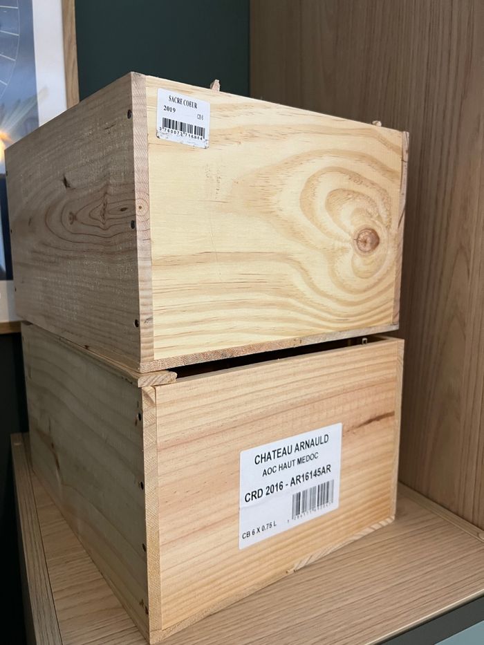 Lot de deux boîtes de rangements en bois rectangulaires / caisses à vins Sacré Coeur Pomerol : Longueur 33 cm x Largeur 28 cm x Profondeur 19 cm Château Arnaud Haut Medoc : Longueur 33.5 cm x Largeur 27 cm x Profondeur 18.6 cm