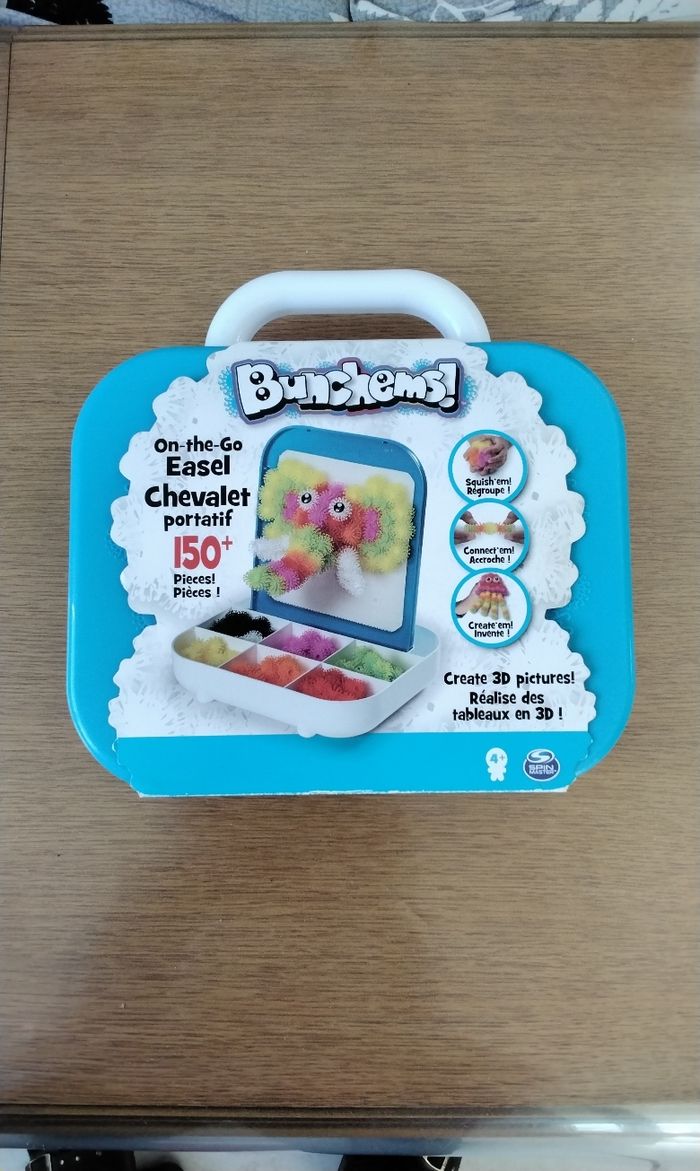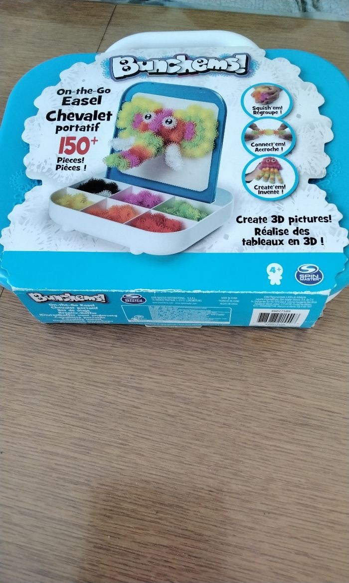Bunchems ! Valisette de 150 pièces, 7 couleurs et 2 yeux , il y a même quelques pièces en plus Dans son emballage, le carton d emballage un peux blanchi, voir photo Le couvercle sert de chevalet pour créer celons les envies ,il y a un velcro Permet de créer sans utiliser colle ou adhésif, il suffit de les presser les uns contre les autres et c'est magique, sa tient tout seul C'est très facile de faire une création et de la redefaire et ranger De toute petites rayures sur le couvercle, je n arrive même pas à les voir sur la photo jointe #moreau36_jouet