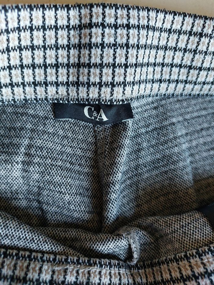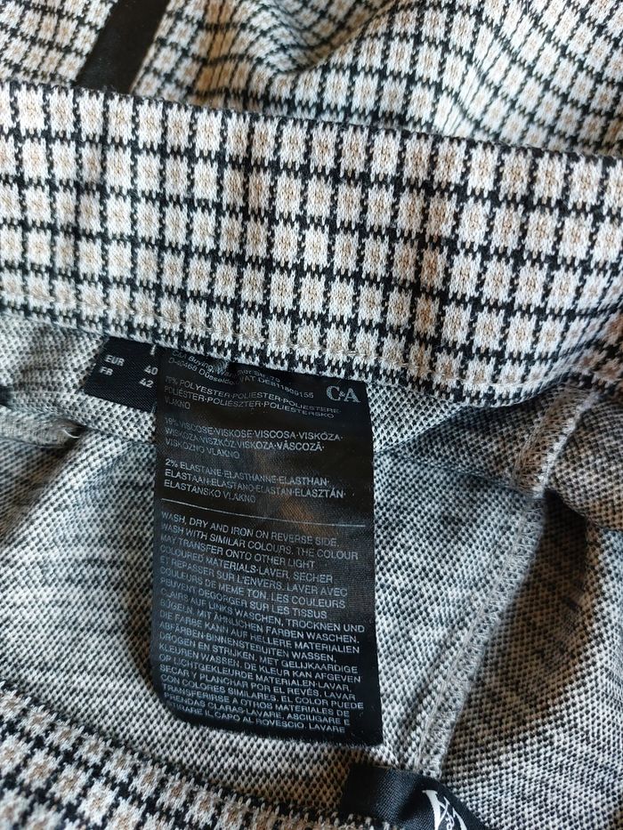 Pantalon slim leegging / femme ~ fille Marque : C & A Taille EUR 40 / FR 42 : voir mesures sur mes photos 2 poches plaquées factices Couleur : noir beige marron 79 % polyester - 19% viscose - 2% élasthanne Lavable à 30°c Très bon état