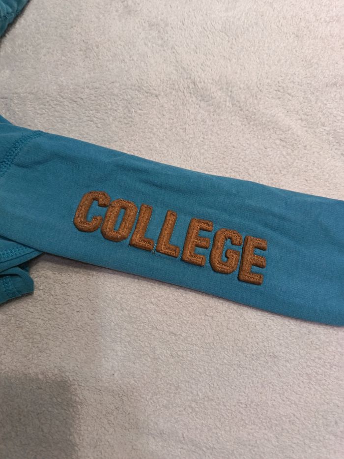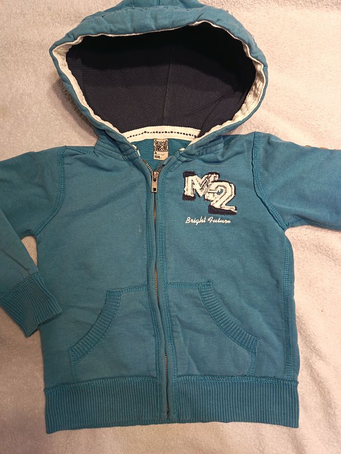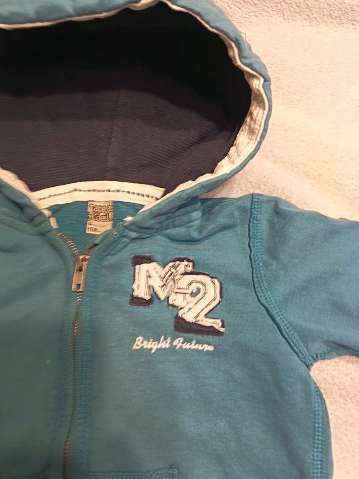 Veste bleu avec capuche doublée fermé par une fermeture zippée deux poches cotées inscription sur la poitrine et sur la manche bord cotes aux poignets et en bas largeur épaule 31 largeur poitrine 36 longueur total 42