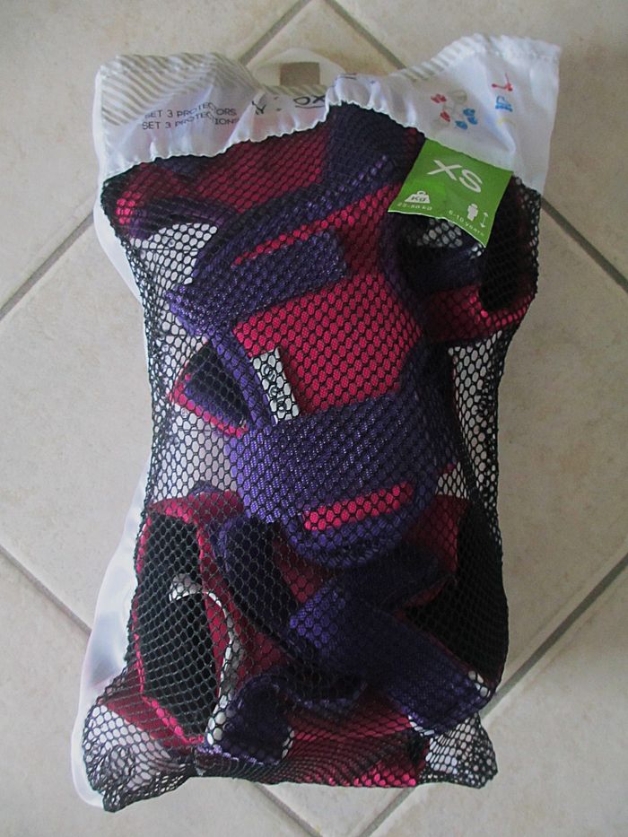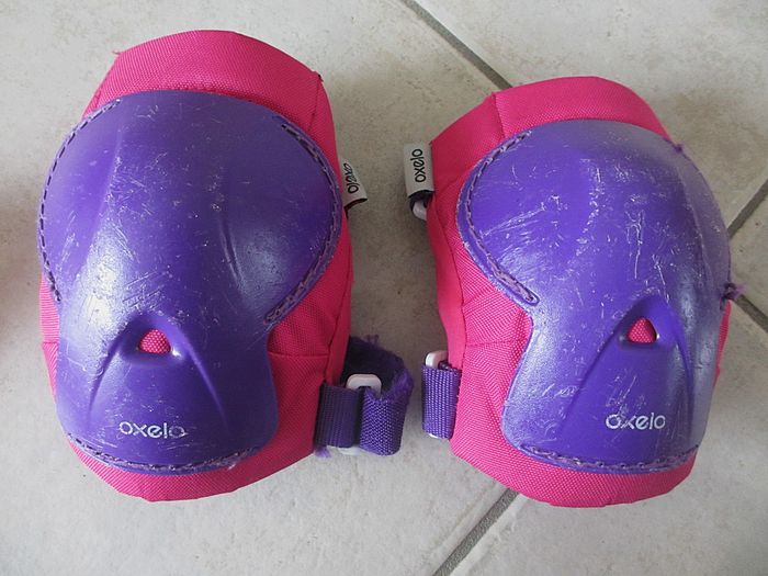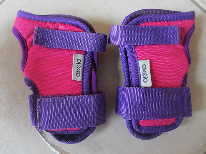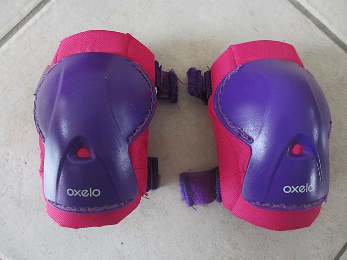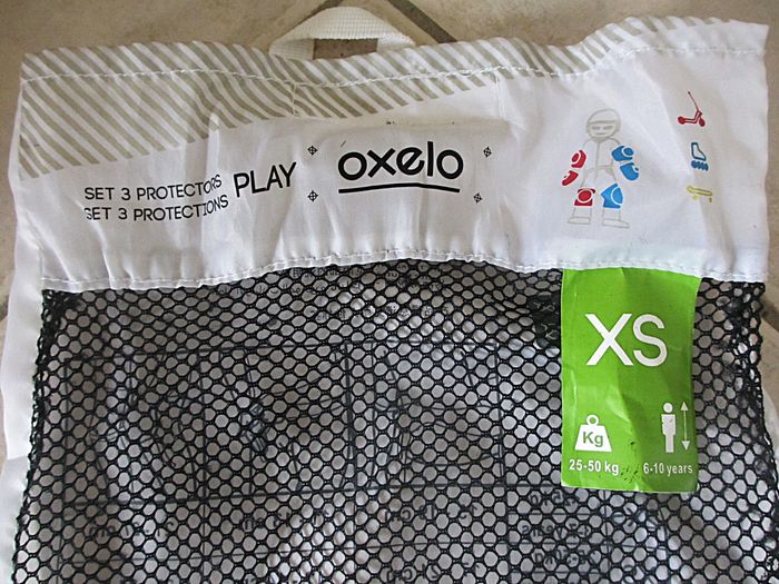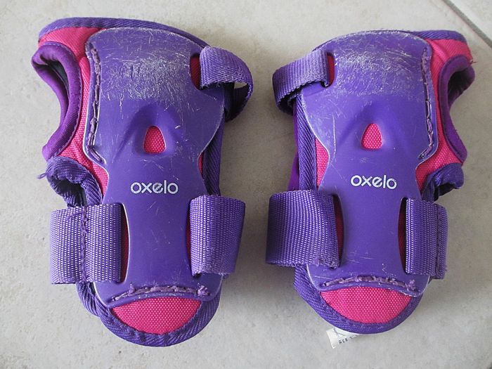 Set de 3 x 2 protections roller / trottinette/ skate enfant Play Oxelo XS 6-10 ans Protège-poignets, protège-coudes et protège-genoux, la base pour débuter en étant rassuré. Bon état (plastiques abîmés sur les protège-poignets et protège-genoux, scratchs un peu abîmés et élastiques un peu détendus sur les protège-genoux).