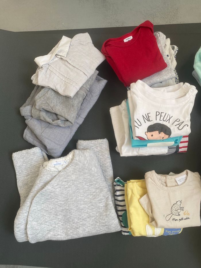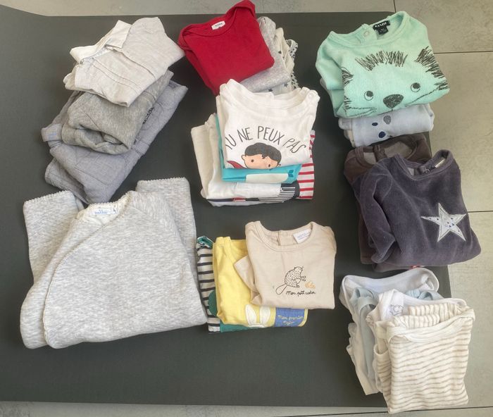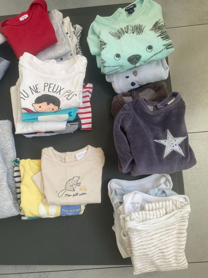 - 4 pyjamas velour (dont 2 jamais portés) - 4 bodys manches courtes - 4 bodys manches longues (petit bateau) - 5 t-shirts manches courtes - 3 t shirts manches longues - 1 veste grise manches longues - 1 gilet gris - 1 chemise grise ikks - 1 beau pyjamas gris bout chou jamais porté