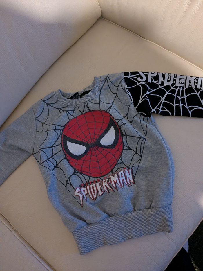Pull sweat garçon 3ans gris clair spiderman avec une manche noire avec une toile araignée insc spiderman