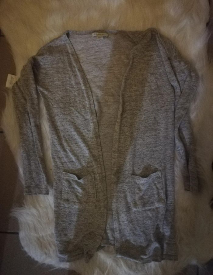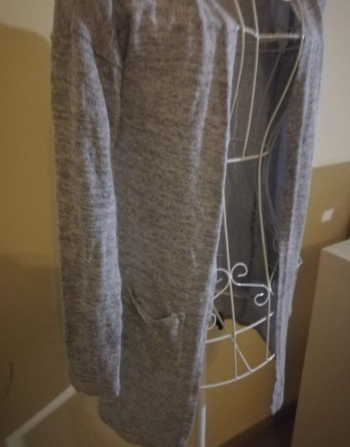 Gilet long et fin. Deux poches. Taille 9-10 ans. Gris clair et blanc.