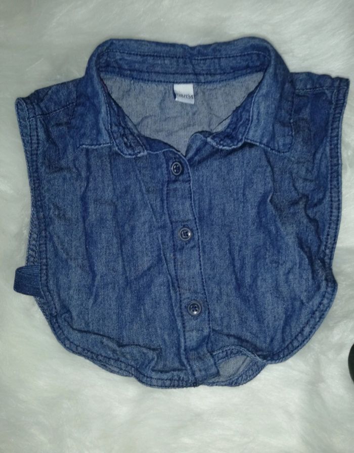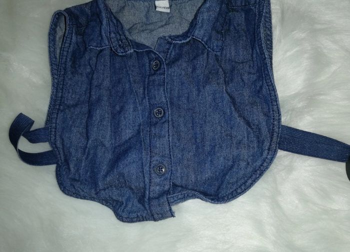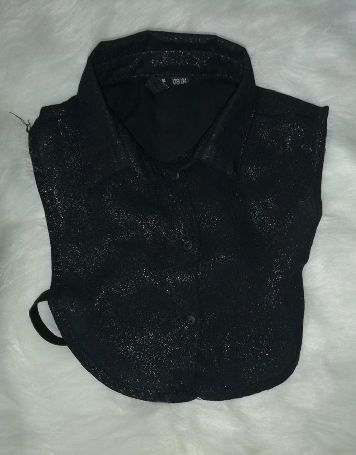 Lot de 2 petits débardeurs décoratifs (style dossard court, à mettre au-dessous d'une blouse ou tee-shirts basic , super mignon portés. Il y a des élastique sur le côté. Un bleu jeans et un noir pailleté. Taille 8-9 ans.