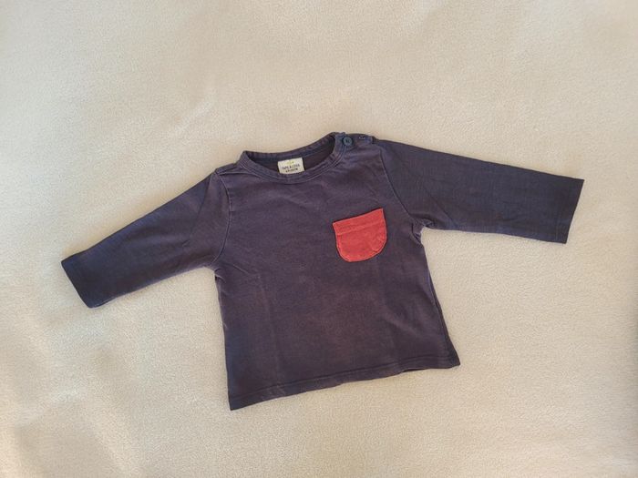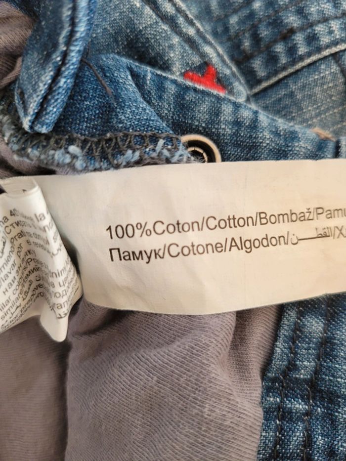 Salopette en jean doublée Fermeture par boutons pression de chaque côté Ouverture par boutons pression au niveau de l'entrejambe Bretelles ajustables 2 positions par boutons pression 100% Coton T-shirt marine manches longues avec petite poche rouge sur le devant 100% Coton