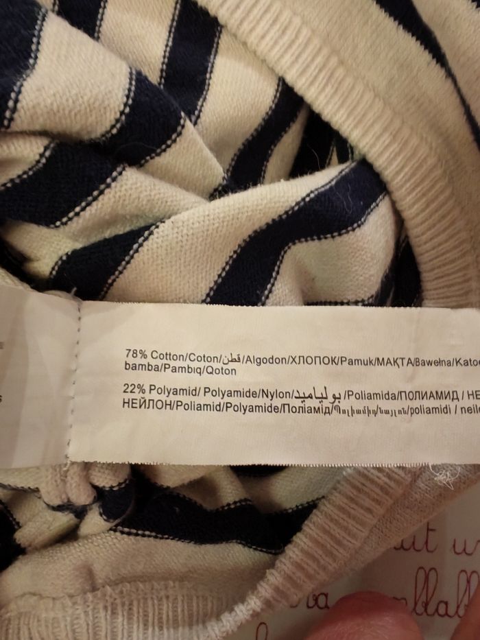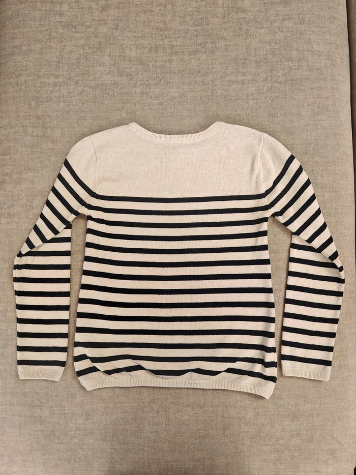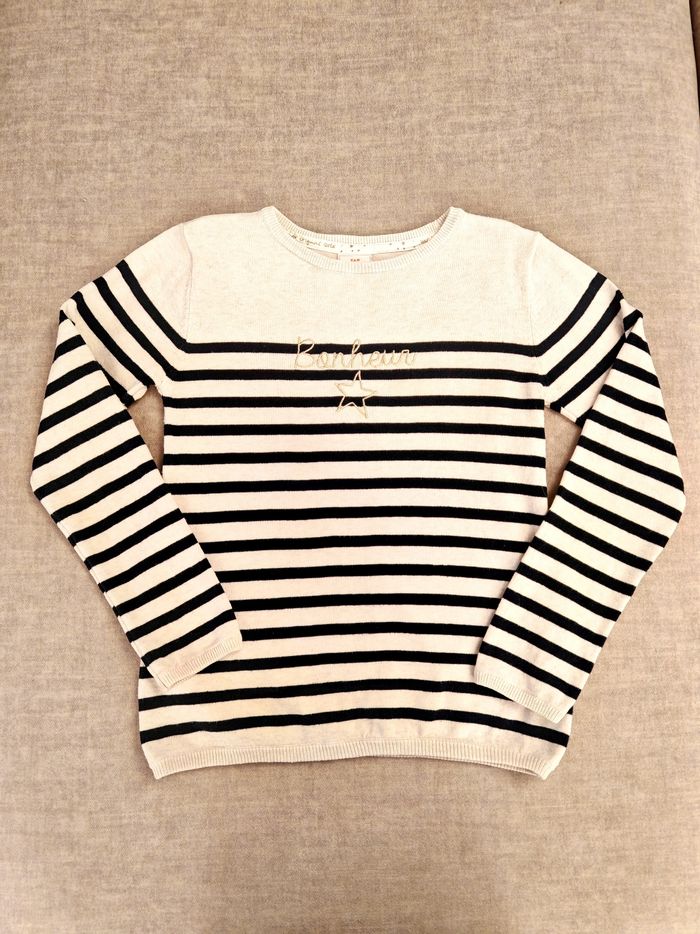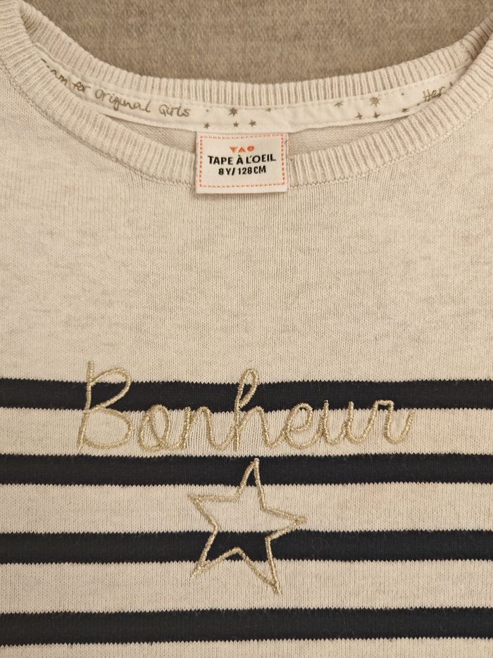 Petit pull marinière Tape à l'Oeil, 8 ans, en très bon état. En coton et polyamide, neige avec rayures noires, mot "bonheur" avec une étoile brodés en fil argenté.