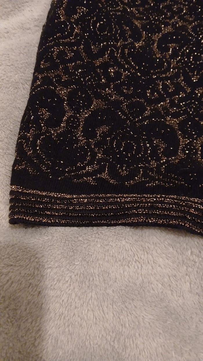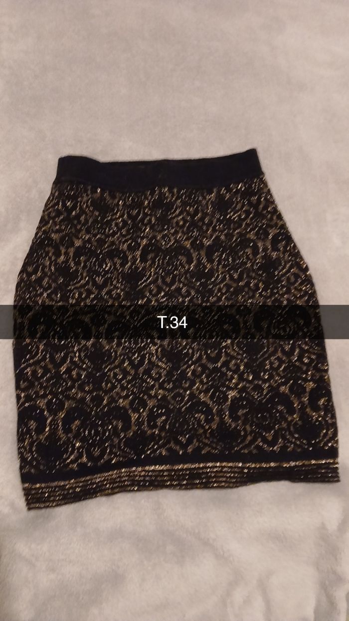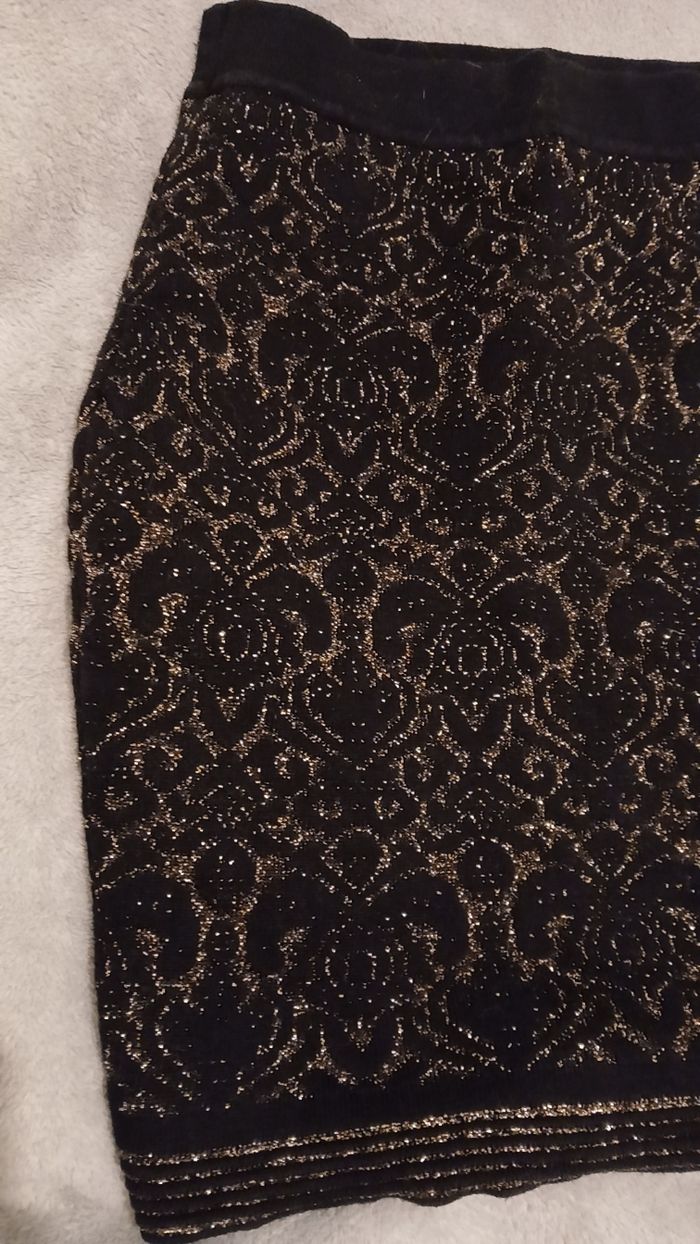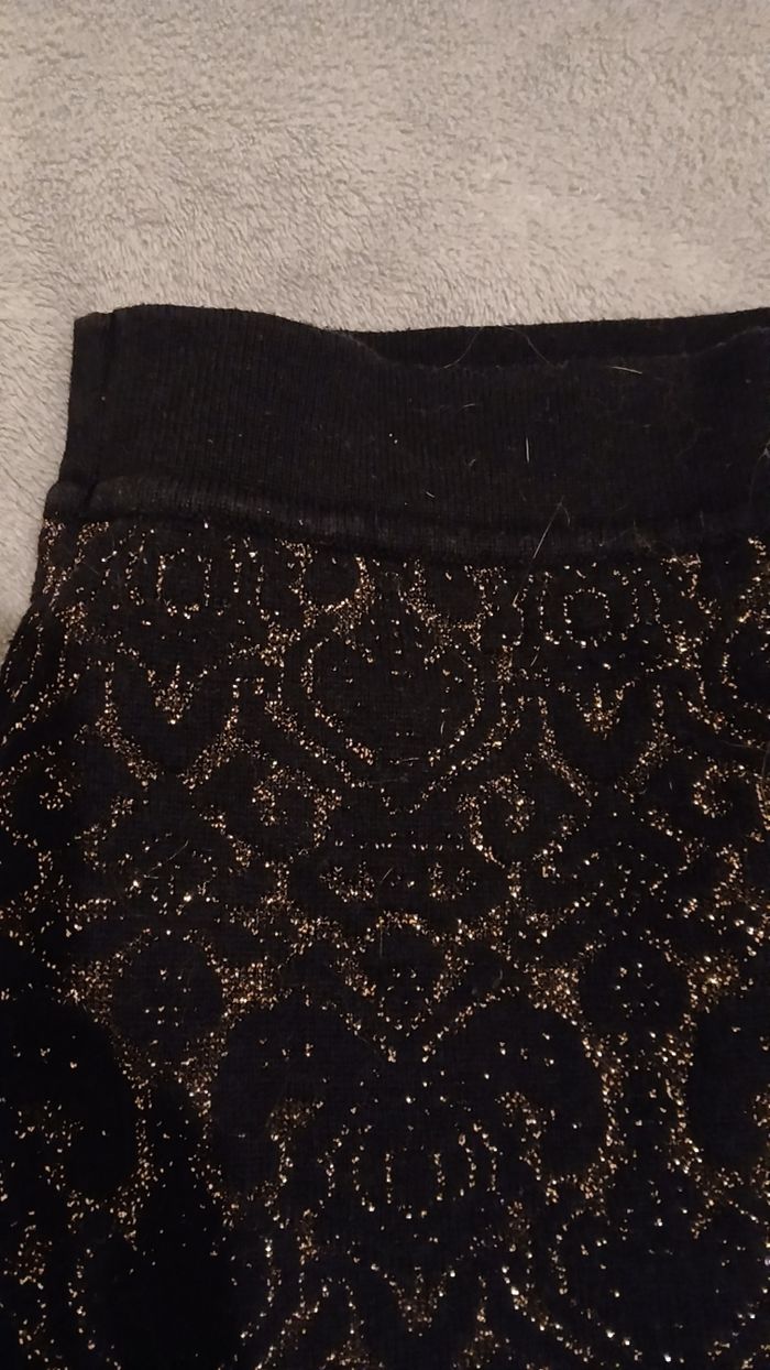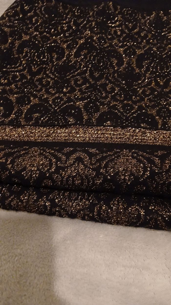 Jupe noir avec reflets dorés. Taille 34, sans étiquette, chaude. Très bon etat
