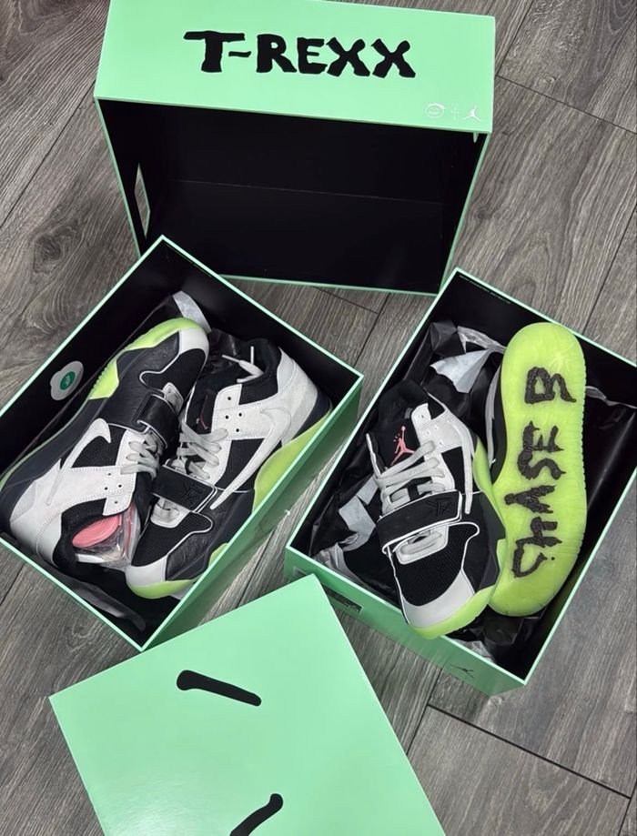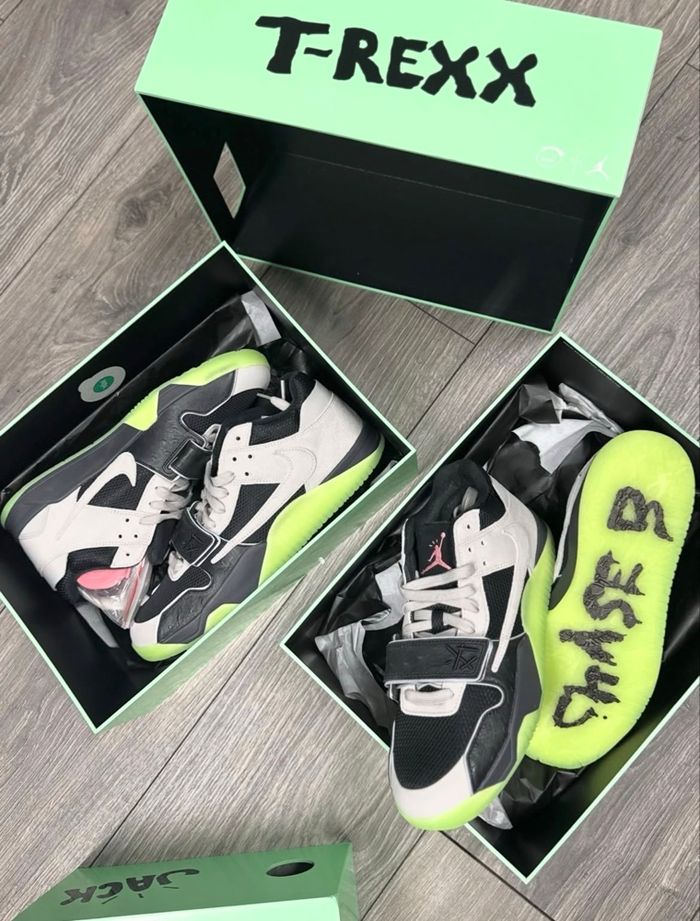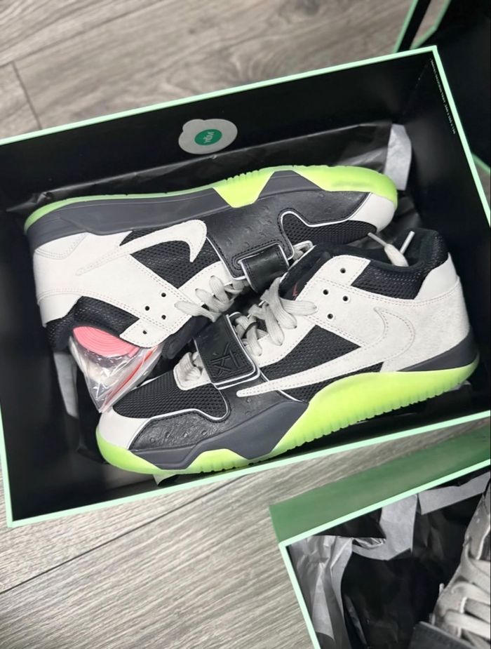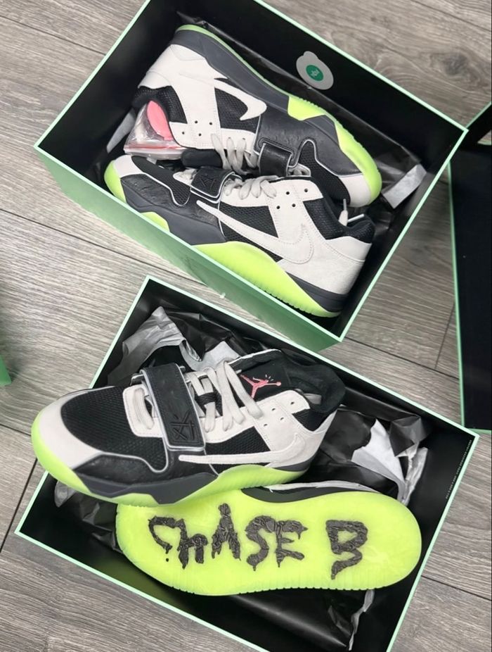Sneakers Jordan Jumpman X Travis Scott X Chase B en édition rare et ultra limitée ! Semelle extérieure phosphorescente verte ! 🚨TAILLE 37,5🚨 Taille normalement ! Expédition ultra rapide ! Baskets neuves, jamais portées ni utilisées !
