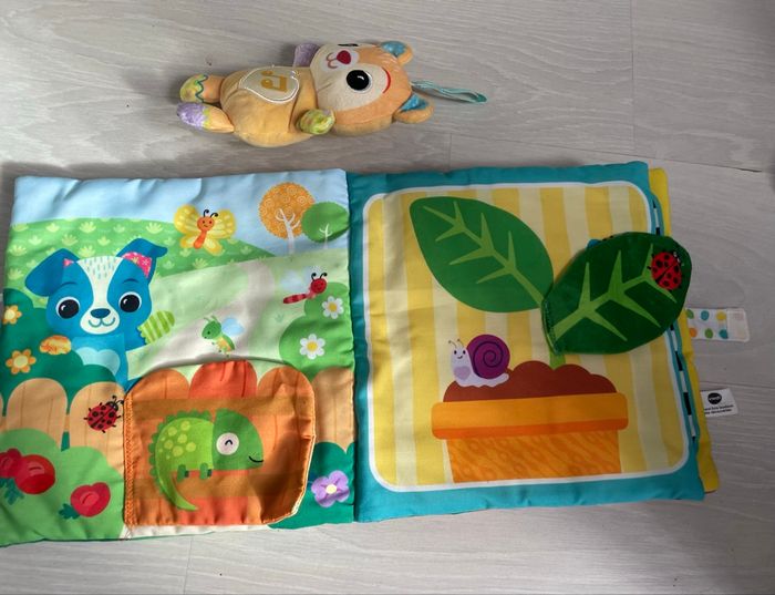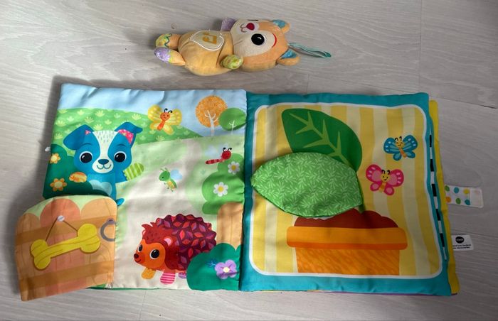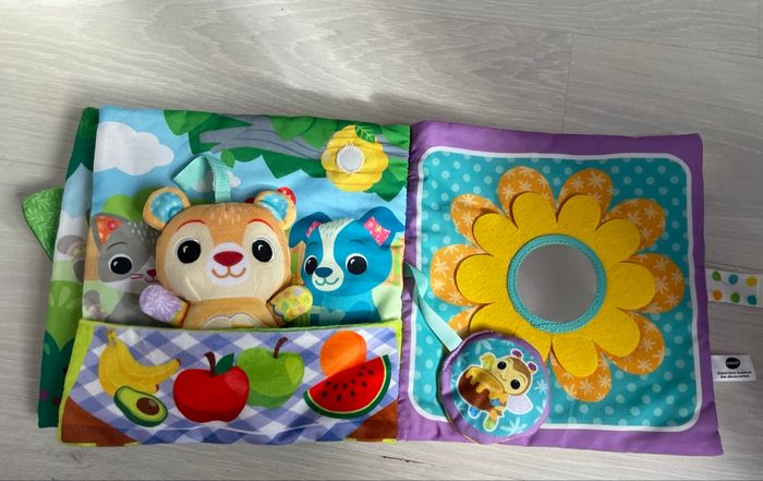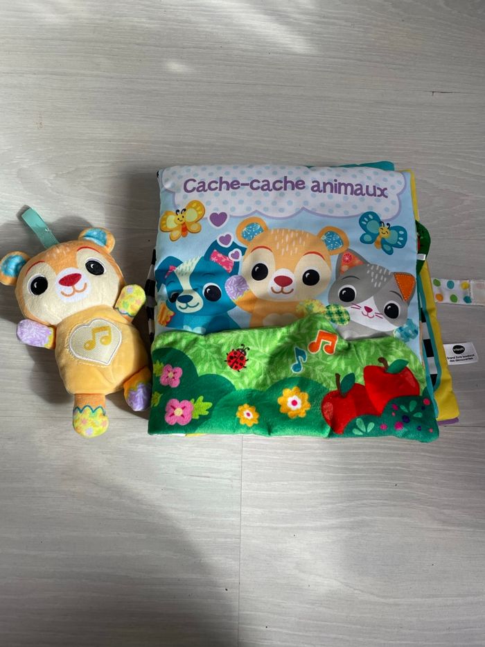 Livre d’activités d’éveil en tissu cache cache animaux, avec sa peluche. La peluche possède un bouton lumineux au ventre qui fait de la musique et chante. Des textures à toucher, des animaux à trouver. Neuf. Envoi rapide et soigné